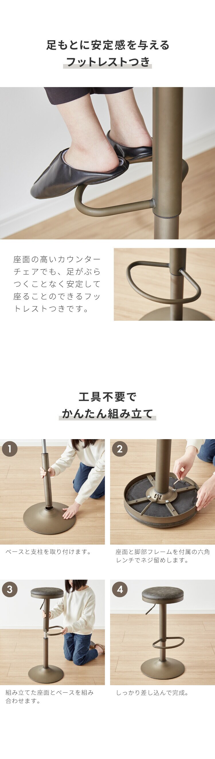 ・座面は360°回転式なので狭いカウンター周りでもイスを引かずに立ち座りができます