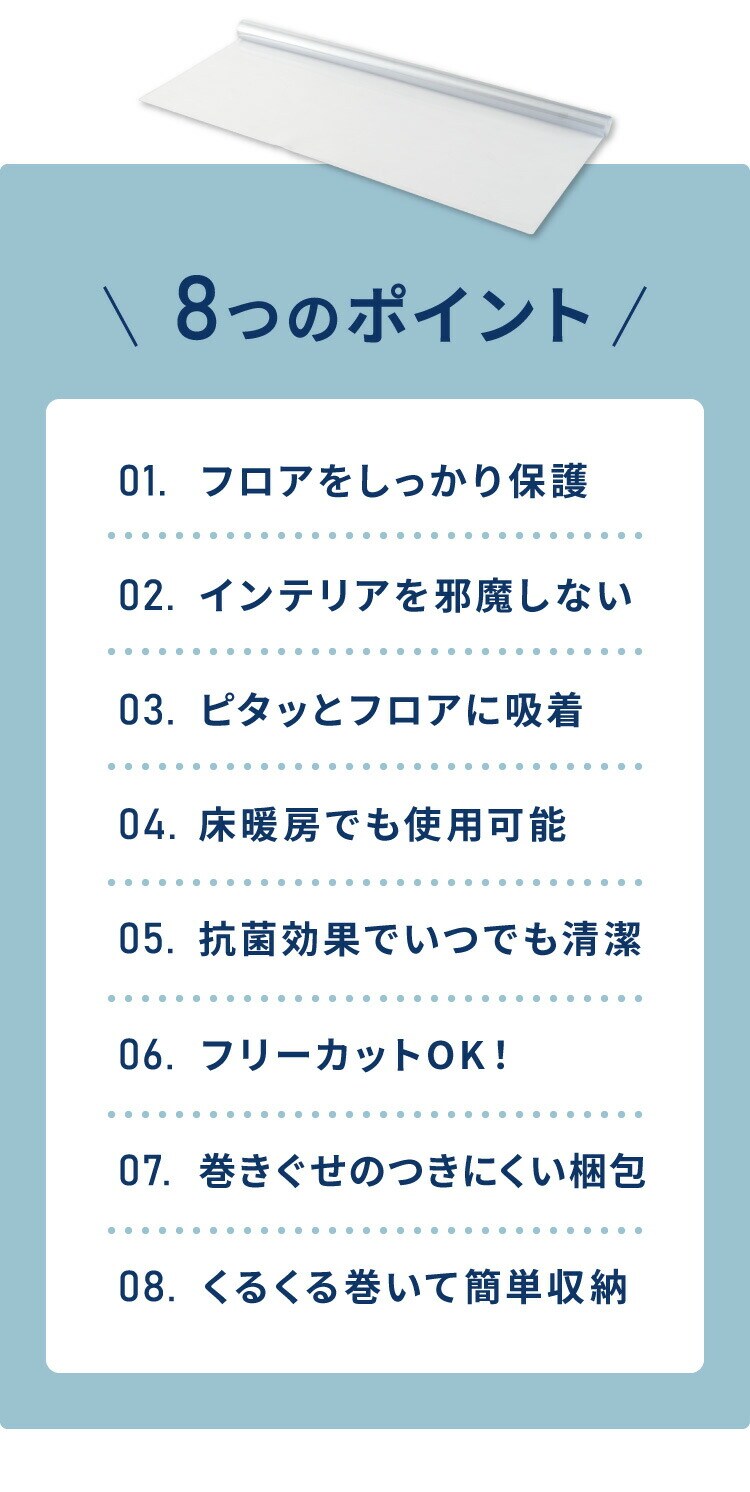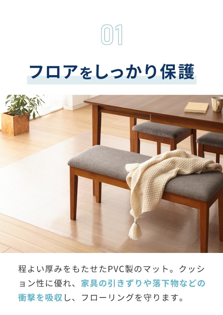 ダイニングマット、ダイニングカーペット、ダイニングクリアマット、クリアダイニングマット、透明マット、透明カーペット、180×300cm、厚さ1.5mm、キズ防止、防キズ、防汚、保護マット、撥水、デスクマット、テーブルマット、チェアマット、プレイマット、ペットマット、賃貸、フローリング、カット自由、フリーカット対応、PVCマット、ノンホルムアルデヒド、簡単収納、床暖房対応、ポリ塩化ビニル、耐熱、防汚、傷防止、透明