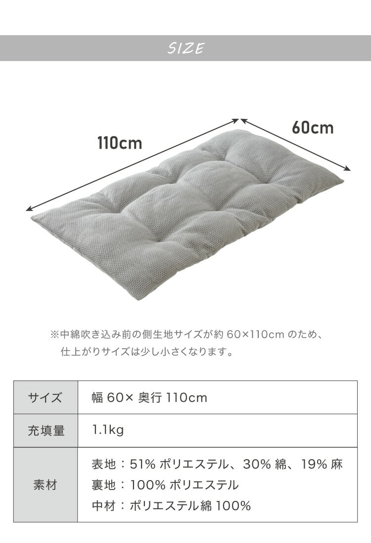 ※中綿吹き込み前の側生地サイズが約60×110cmのため、仕上がりサイズは少し小さくなります。