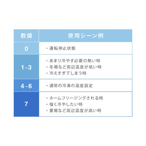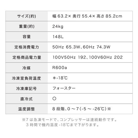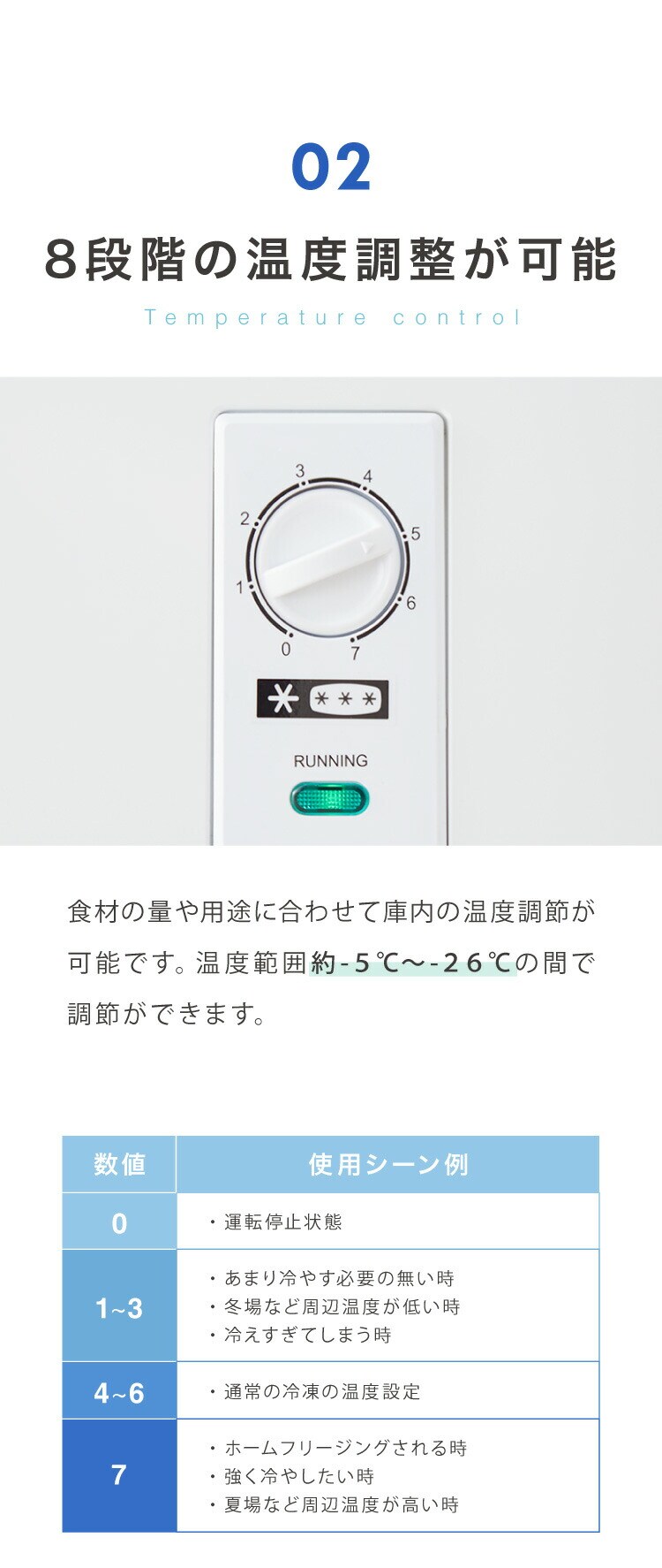 温度調節:温度調整 8段階 0~7(-5~-26℃)※7は急凍モードで、コンプレッサーは連続動作です、3時間で機内温度-18℃まで