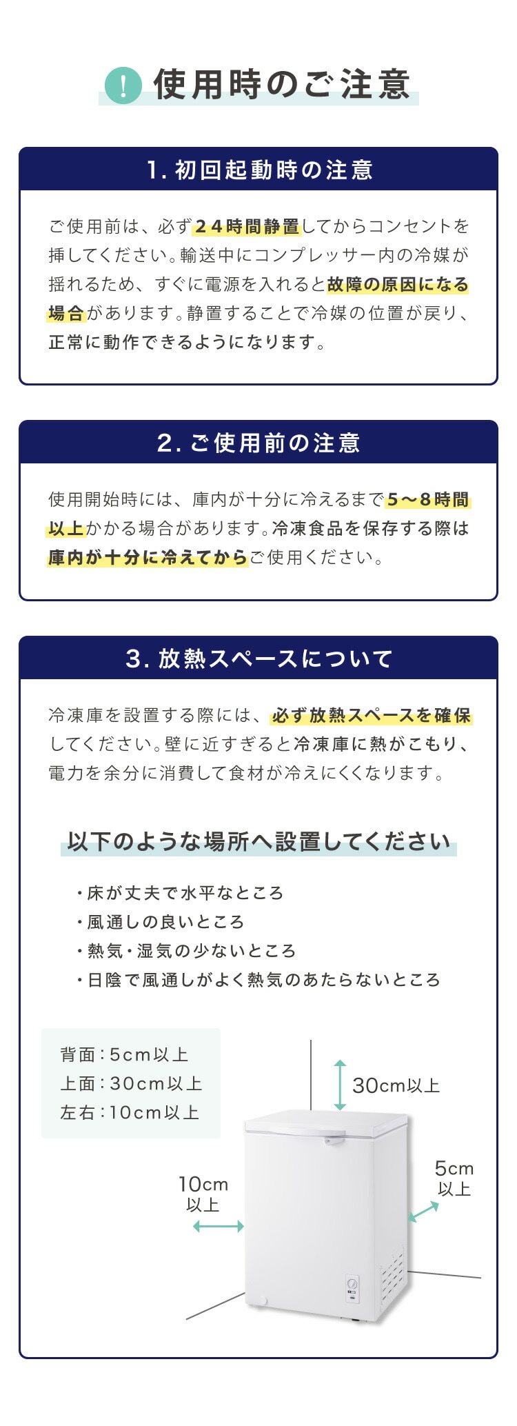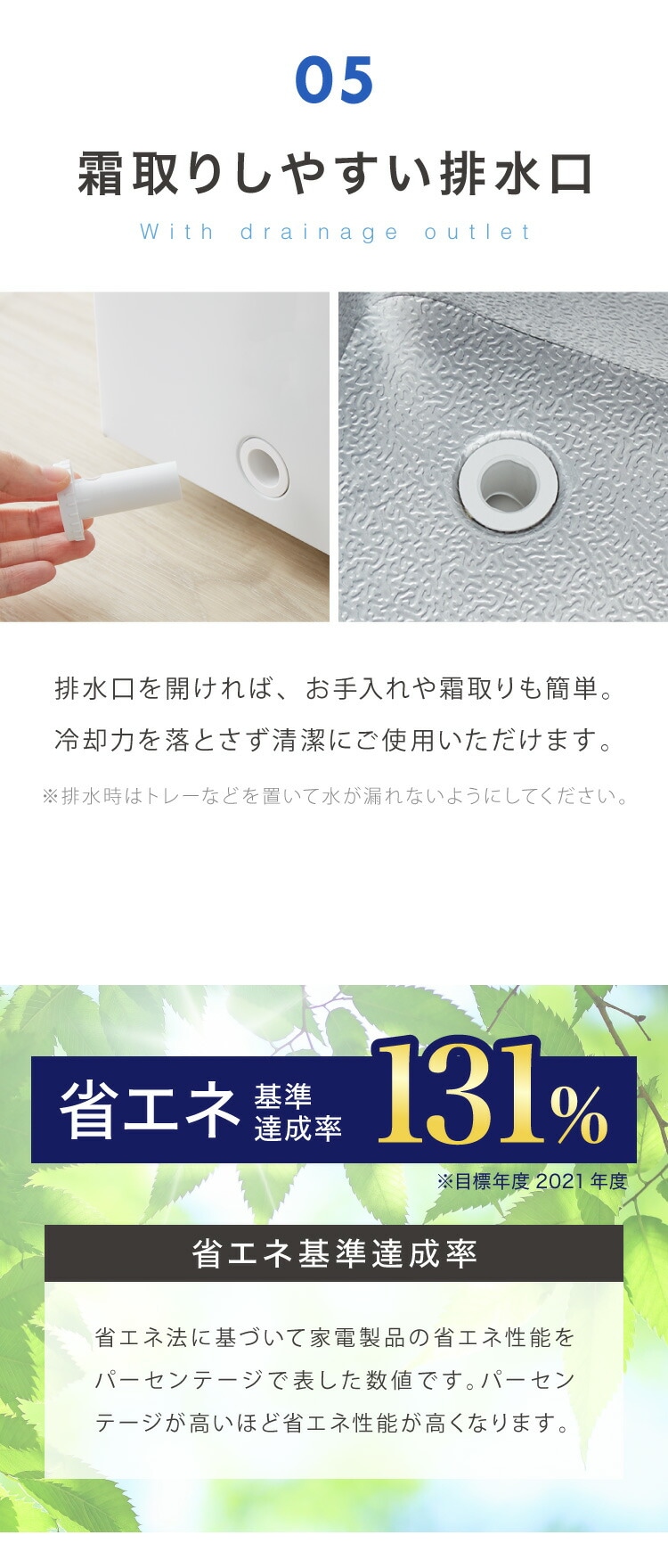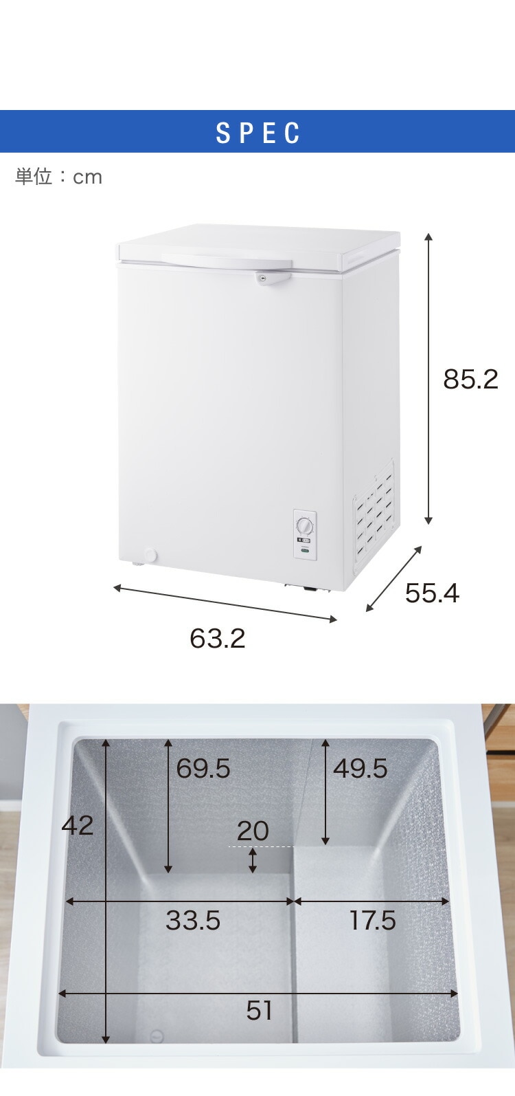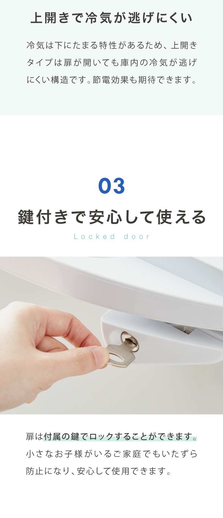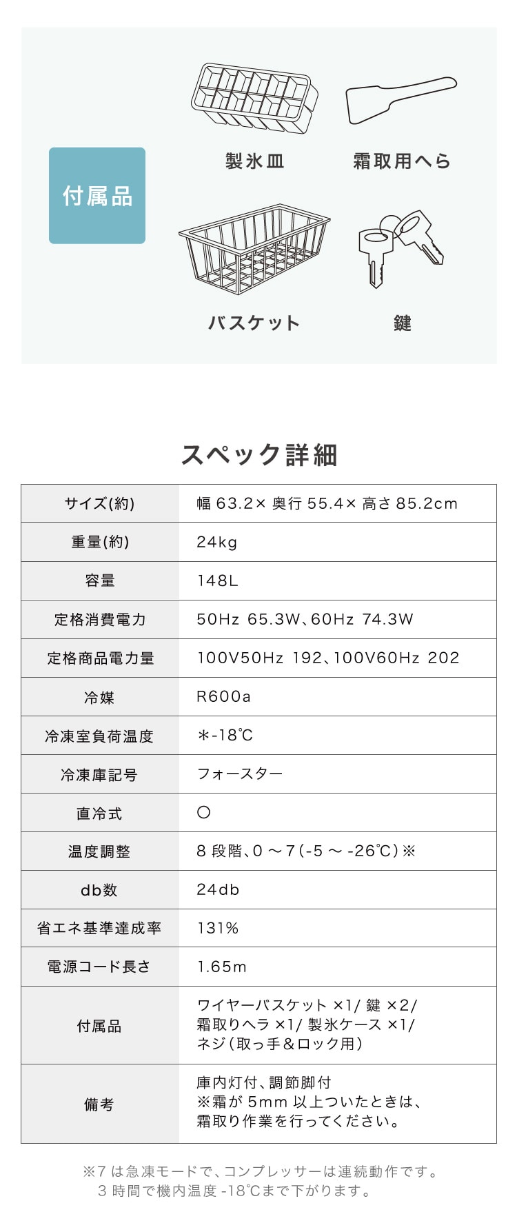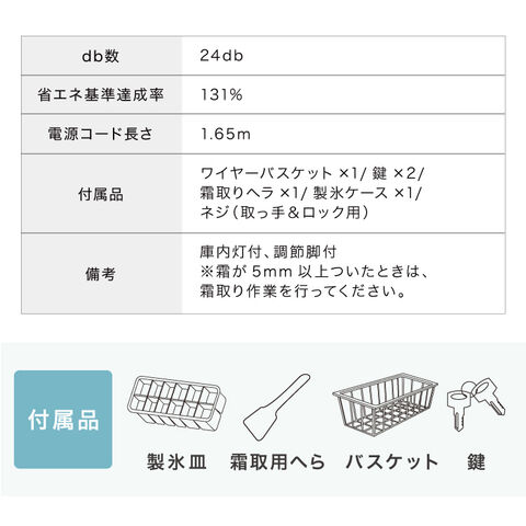 付属品:ワイヤーバスケット×1/鍵×2/霜取りヘラ×1/製氷ケース×1/ネジ(取って&ロック用)※霜が5mm以上ついたときは、霜取り作業を行ってください。