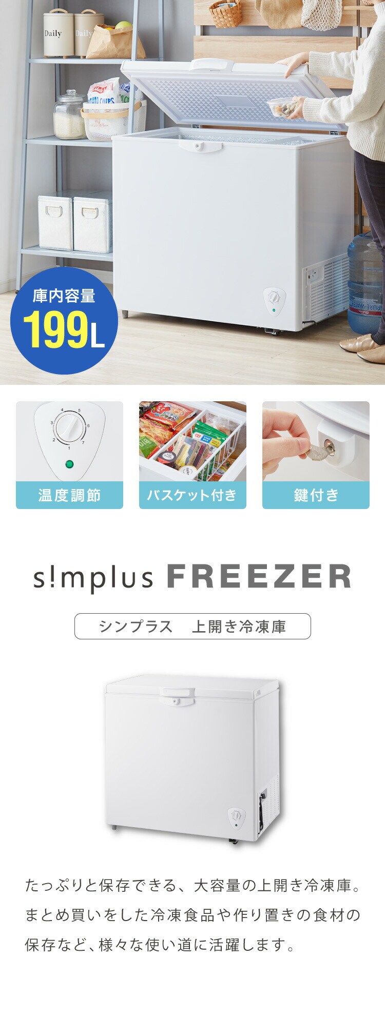 simplus 冷凍庫 上開き 199L バスケット2個付き 鍵付き 静音 大容量 冷凍冷蔵庫 省エネ 温度調整 冷凍ストック まとめ買い 冷凍食品 SP-199LUPD シンプラス【送料無料】