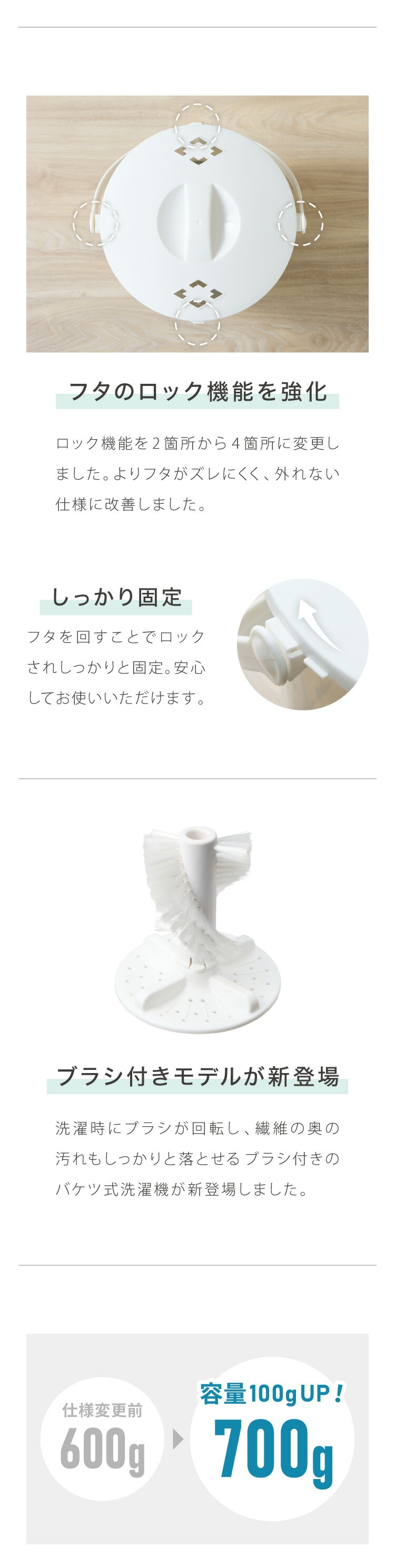 トルク調整により水漏れを防ぎつつ、洗濯容量も600gから700gにアップし、より多くの衣類を一度に洗えます。