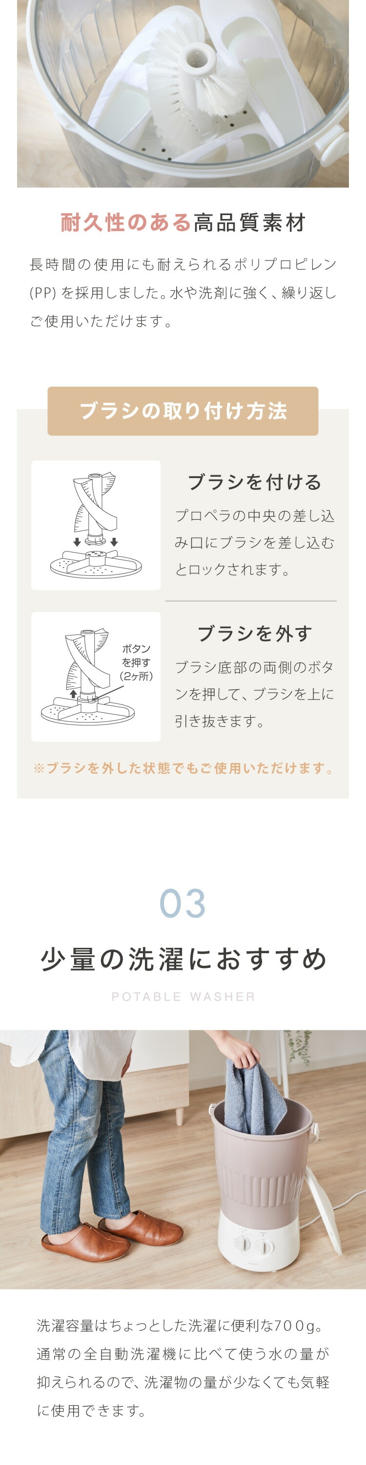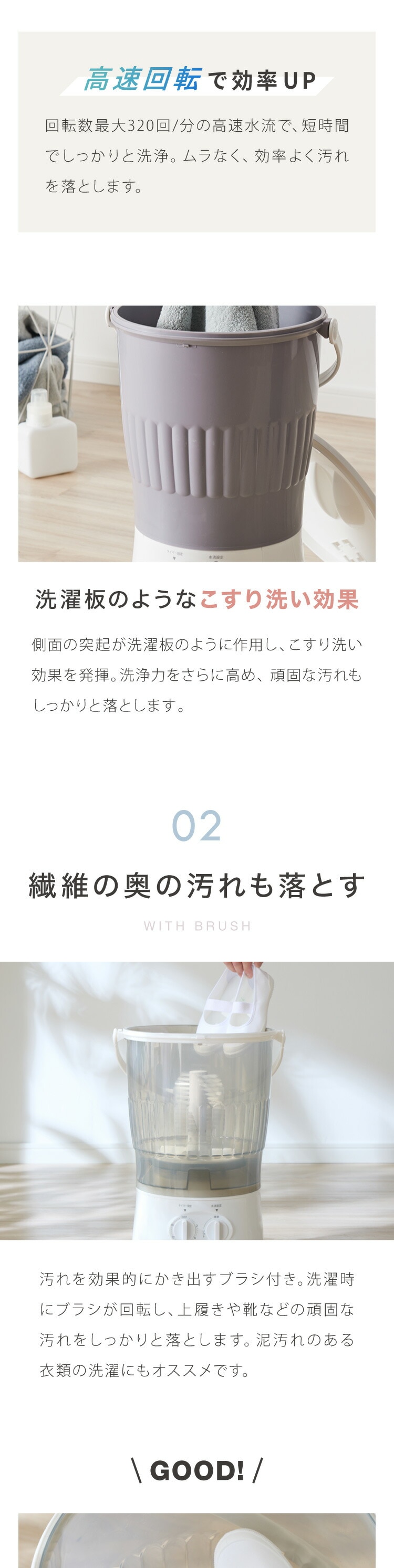 洗濯時にブラシが回転し、繊維の奥の汚れもしっかり落とせる強力洗浄タイプ。