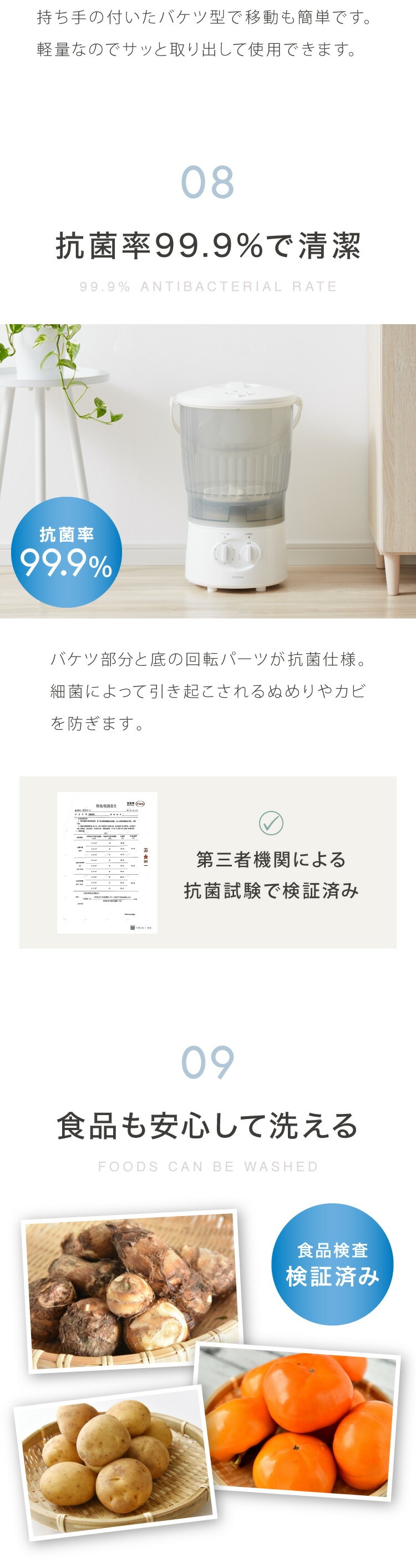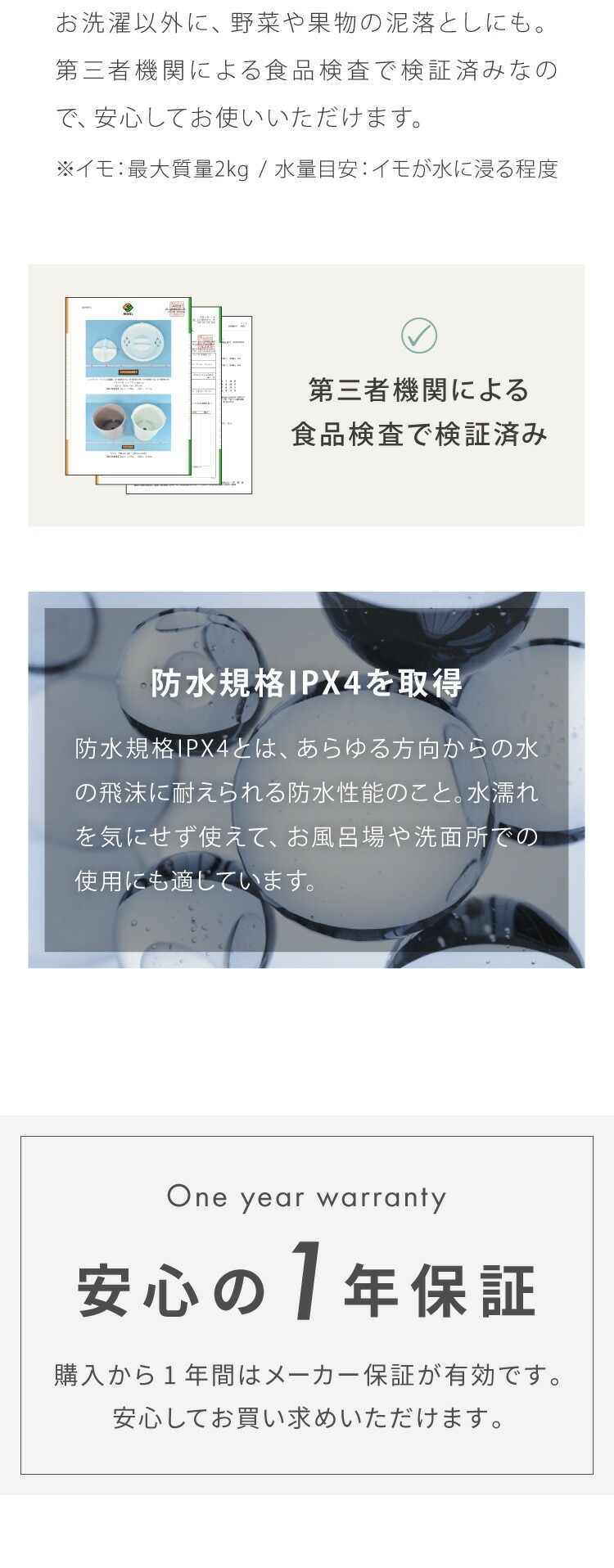 第三者機関にて食品検査も実施済の為、洗濯以外野菜や果物の泥落としにも使えます。