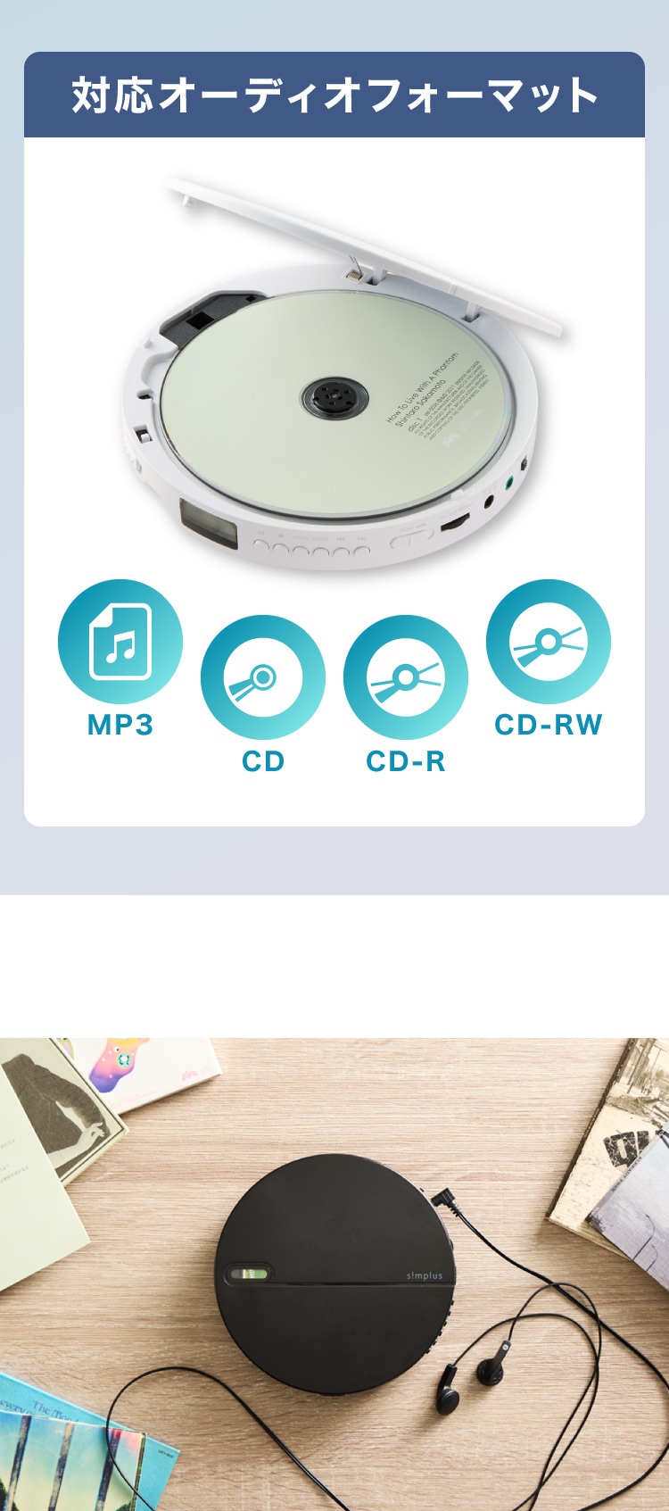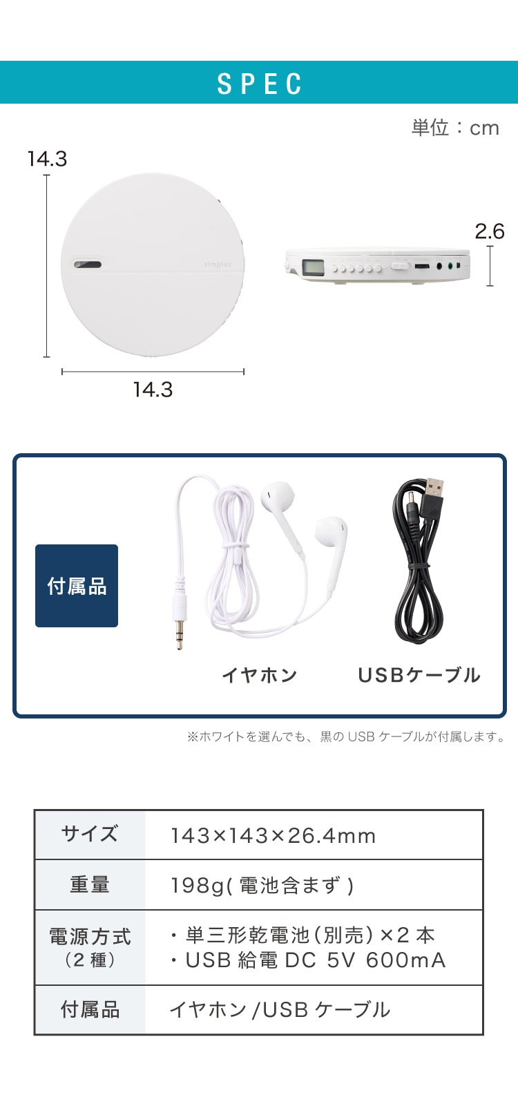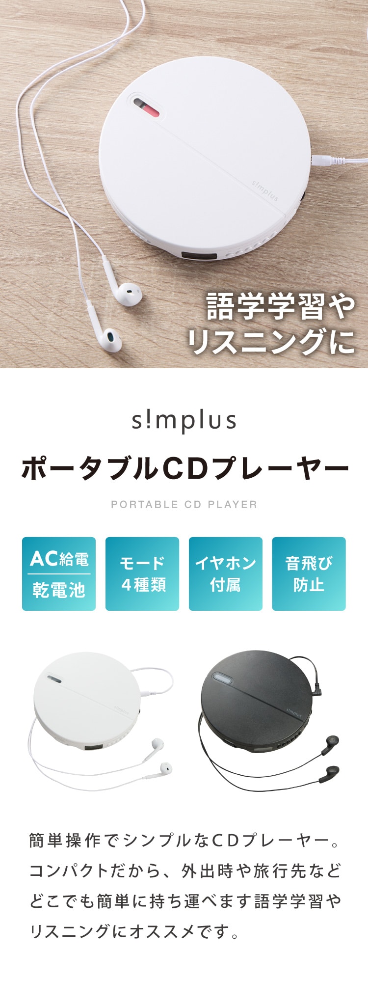 simplus CDプレーヤー ポータブル 2電源対応 小型 乾電池 USB給電 イヤホン付き リスニング プログラム再生 リピート再生 イントロ再生 語学学習 学生 持ち運び シンプラス SP-CDP01【メーカー保証1年】