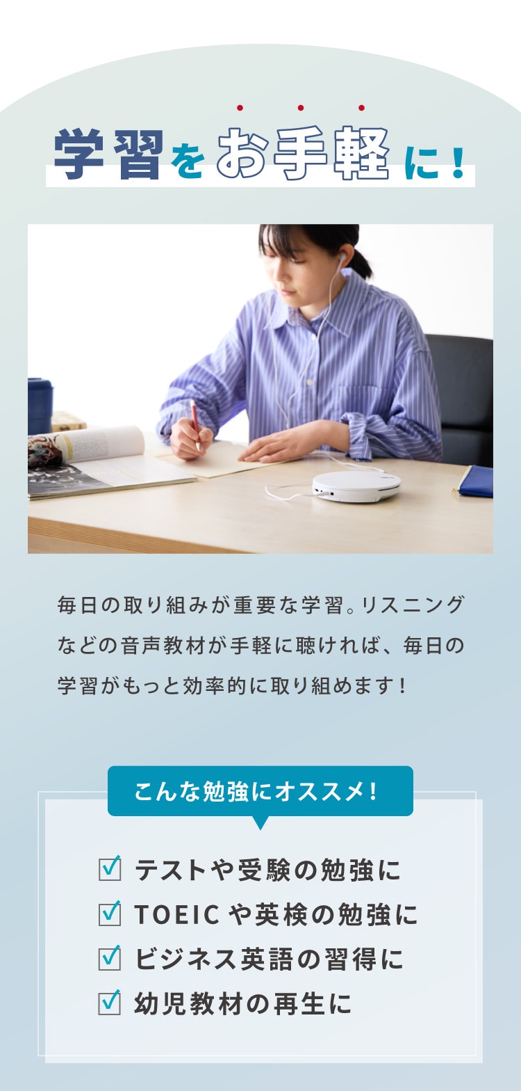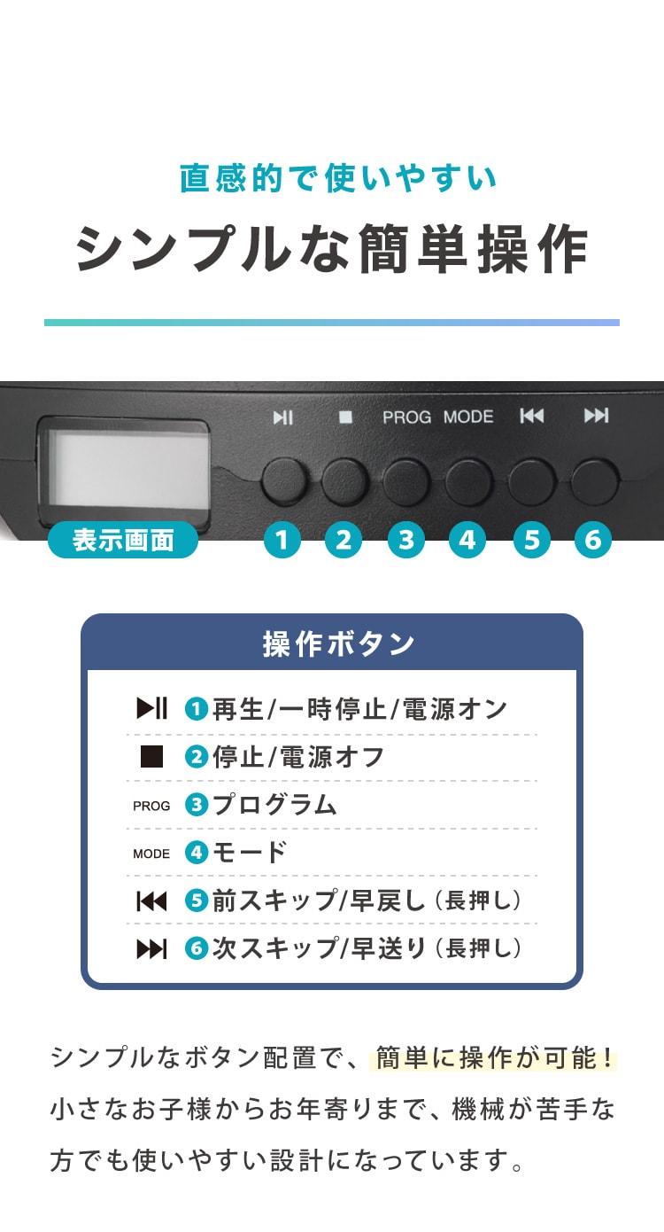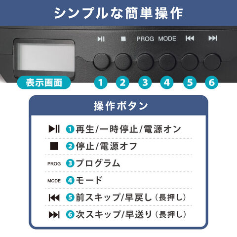 CDプレーヤー、ポータブルCDプレーヤー、音楽プレーヤー、オーディオプレーヤー、語学学習、CD学習、英語、勉強、リスニング、ヒアリング、TOEIC、TOEFL、英検、入試、受験勉強、簡単操作、使いやすい、誤作動防止機能、音飛び防止、早送り、早戻し、リピート再生、イントロ再生、プログラム再生、重低音、2WAY電源、乾電池、USB給電、家庭用コンセント、携帯、持ち運び、小型、コンパクト、薄型、子供、高齢者、学生イヤホン付き、シンプル、おしゃれ、オシャレ