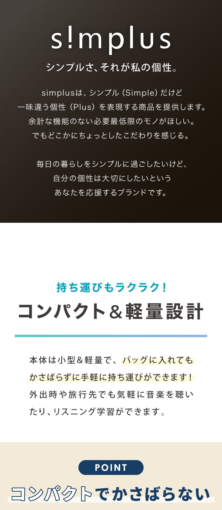 本体は小型・軽量で、バッグに入れてもかさばらず、どこへでも簡単に持ち運べます。外出時や旅行先でも気軽に音楽を楽しめます。