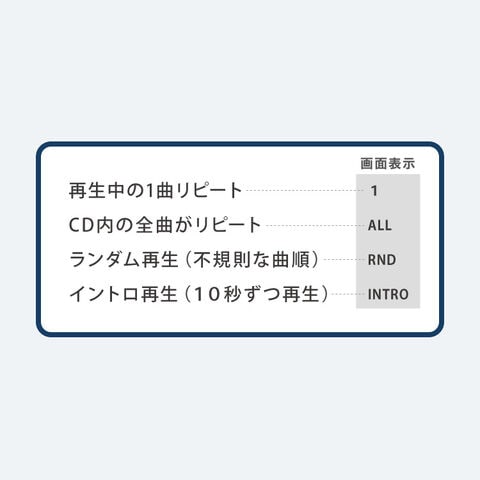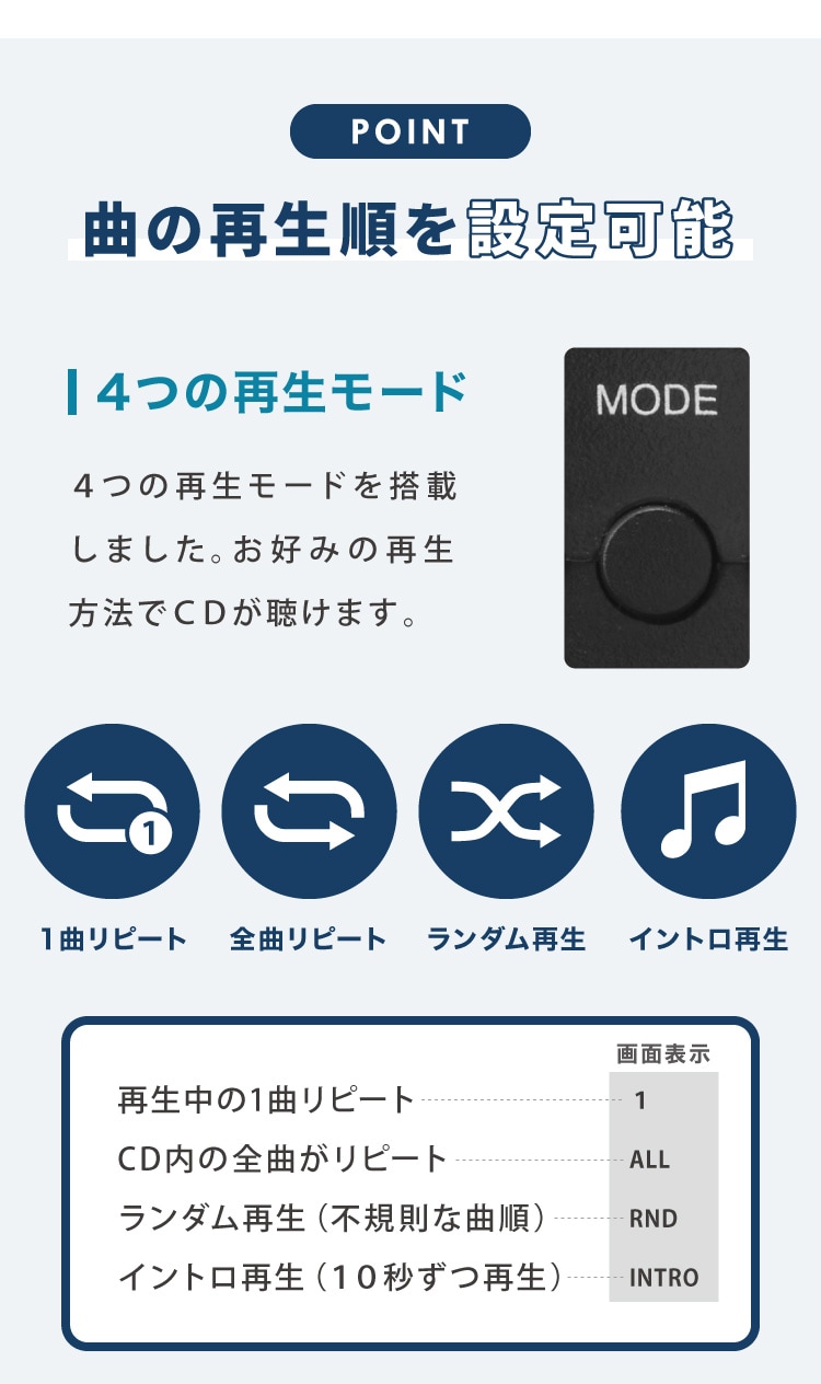 一曲リピート再生、全曲リピート再生、ランダム再生、イントロ再生(全ての曲を10秒ずつ再生)の4つのモードを搭載。お好みの再生方法で音楽を楽しめます。
