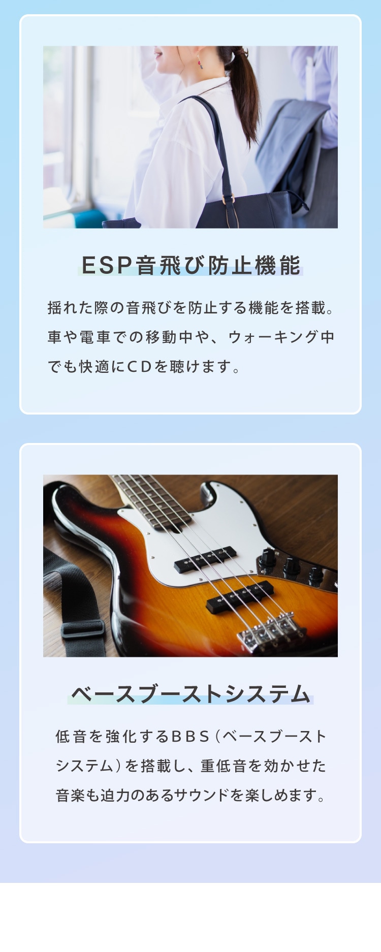 ESP(Electronic Skip Protection)技術により、移動中や振動のある場所でも音飛びを防止。快適な音楽再生を実現します。