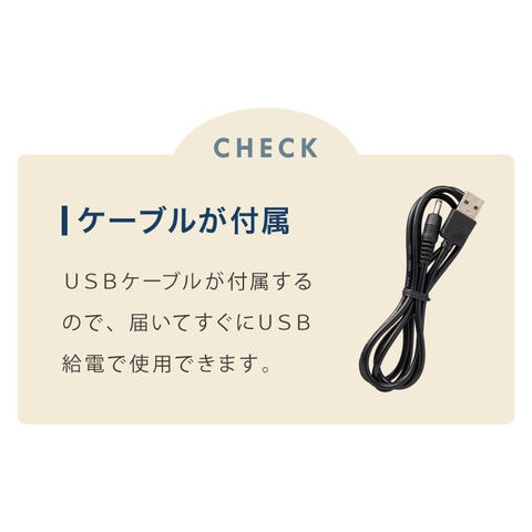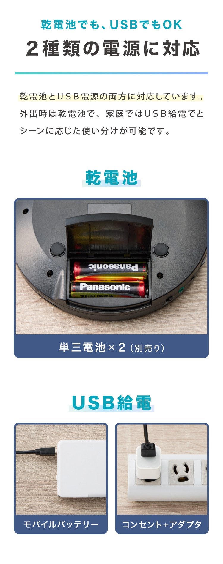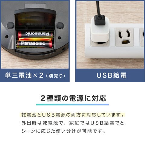 乾電池とUSB電源の両方に対応しており、外出時は乾電池で、家庭ではUSB給電で使用可能。シーンに応じて便利に使い分けできます。