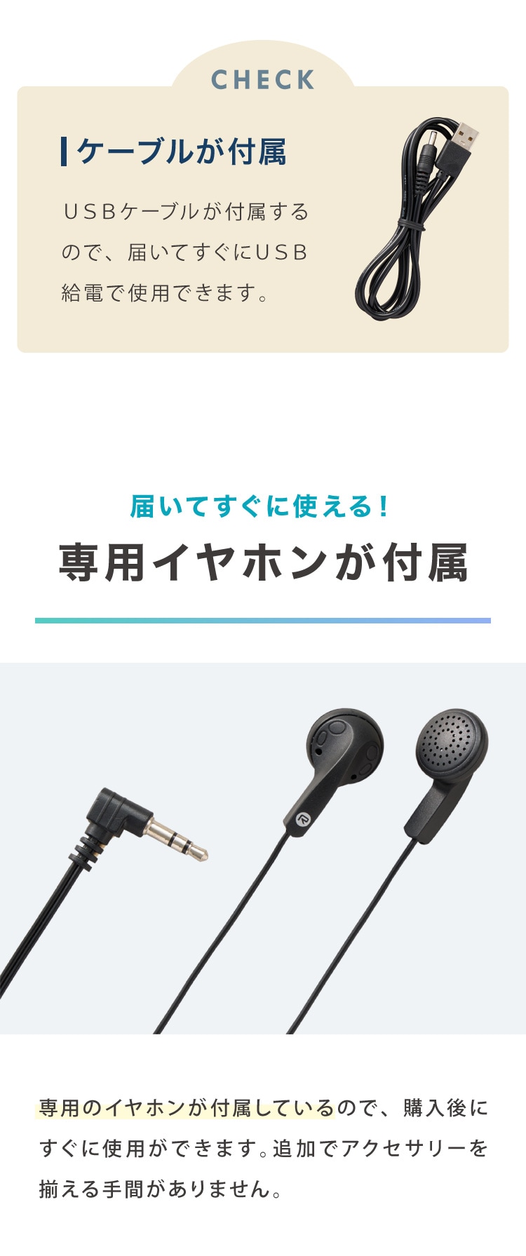 専用イヤホンとUSBケーブルが付属しているので、購入後すぐに使用可能。追加でアクセサリーを揃える手間がありません。
