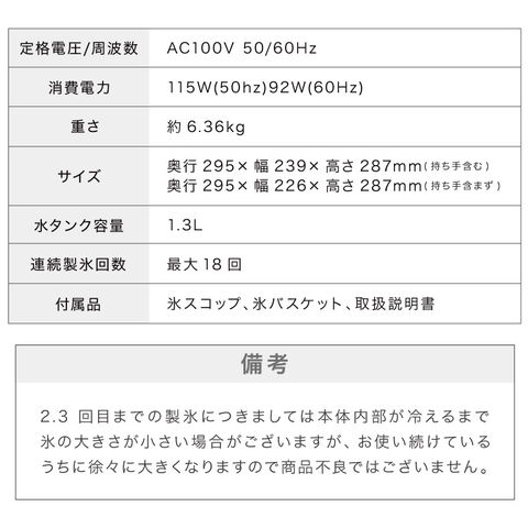付属品:氷スコップ、氷バスケット、取扱説明書