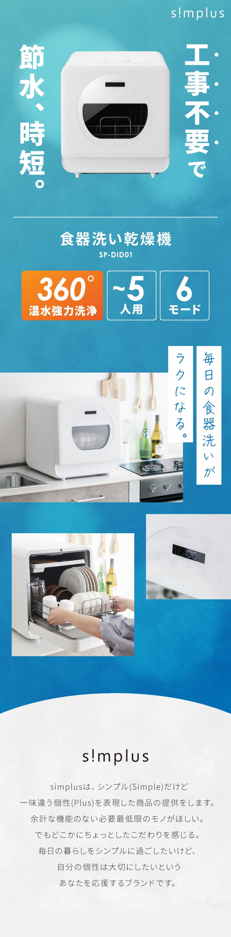 simplus 食洗機 独立乾燥モード搭載 工事不要 3~4人用 食器洗い乾燥機 強力洗浄 食洗器 食器乾燥 高温洗浄 洗浄タンク式 節水 皿洗い 新生活 シンプラス SP-DID01-WH【送料無料】