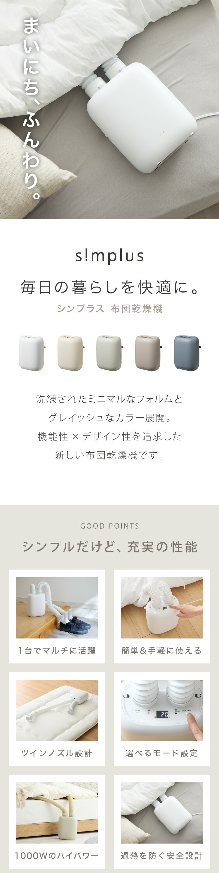 simplus 布団乾燥機 ツインノズル シューズドライヤー ダニ退治 コンパクト 消臭 アロマ対応 カビ ダニ ふとん乾燥機 くつ乾燥 梅雨 湿気対策 タイマー予約 3段階温度調節 シンプラス SP-FDYB01【送料無料】のレビュー