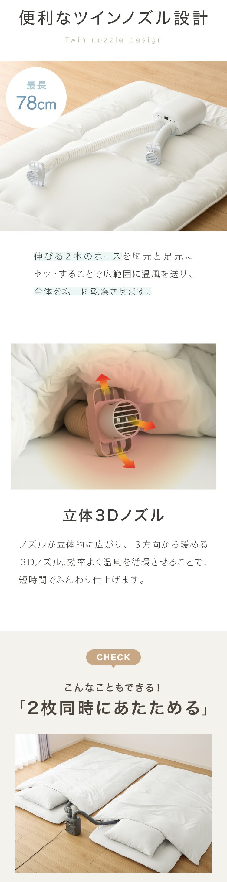 2本のホースで広範囲に温風を送り、布団や衣類を均一に乾燥させます。