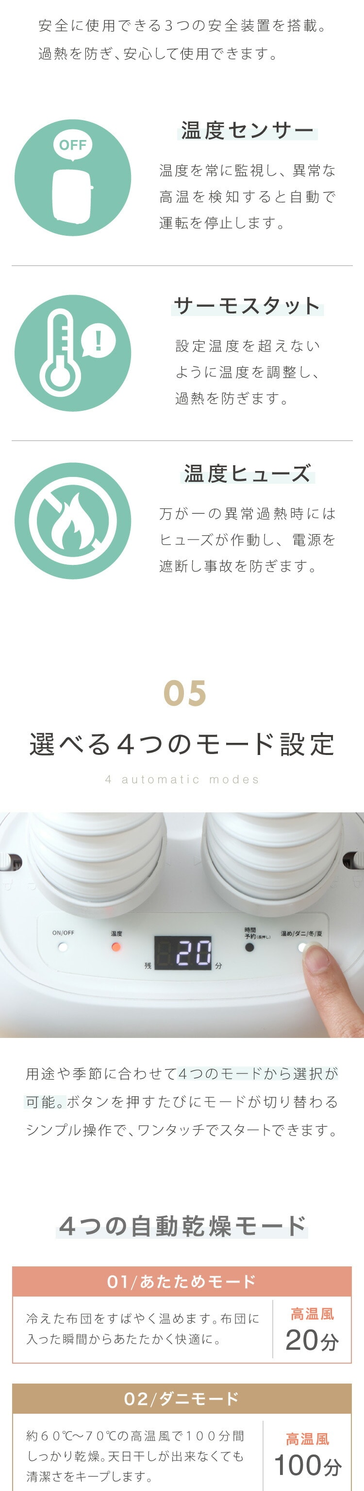 布団・衣類・靴・送風など、用途に応じた最適な乾燥モードを搭載。
