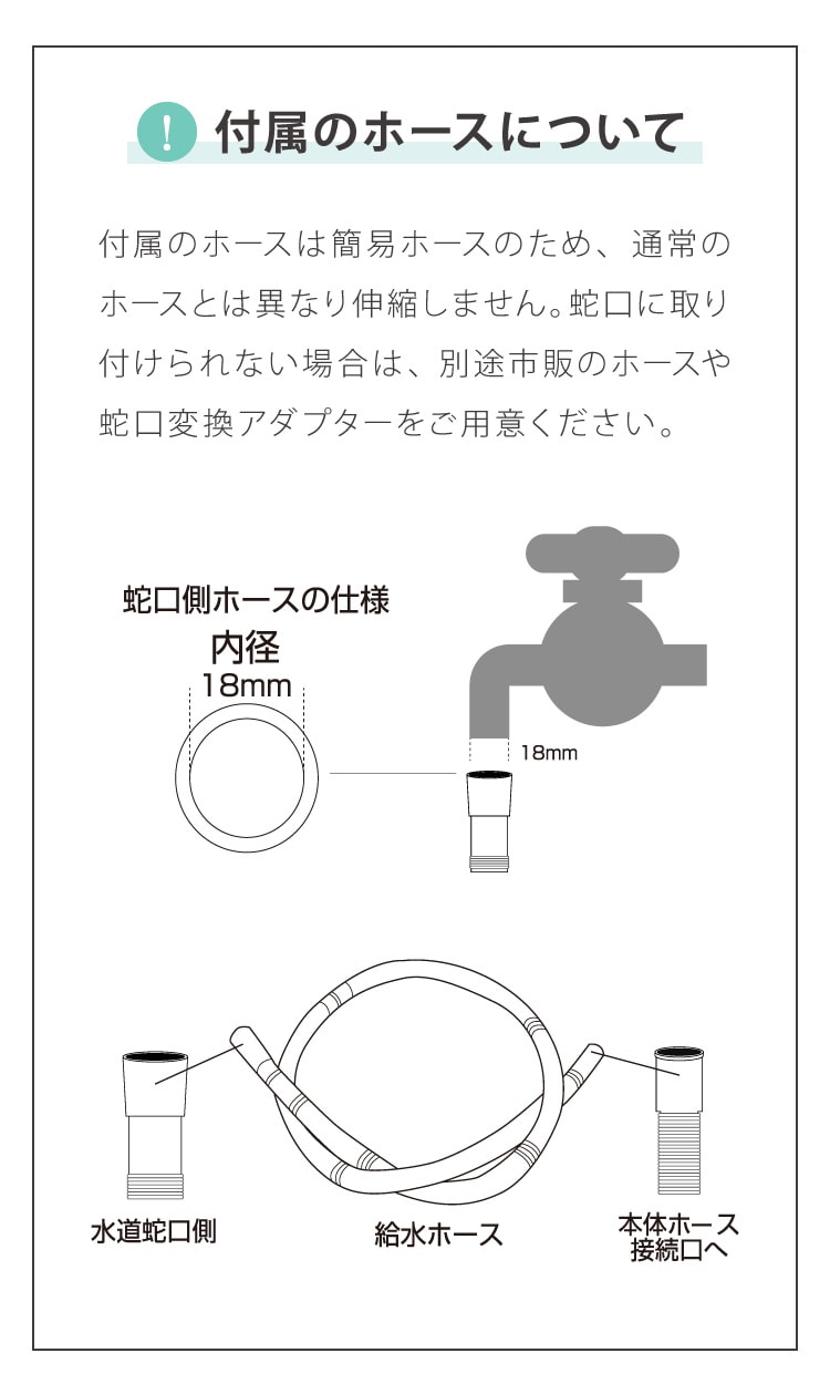11.付属品として排水ホース、給水ホース、脱水槽と脱水用おさえ蓋付き