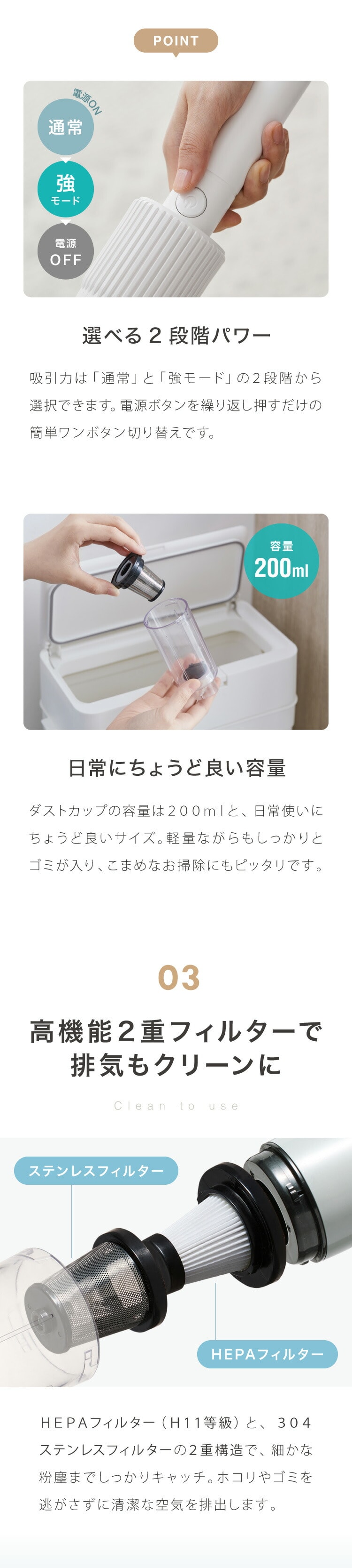 使う場所を選ばず、車内清掃や外出先でも便利に使えます。