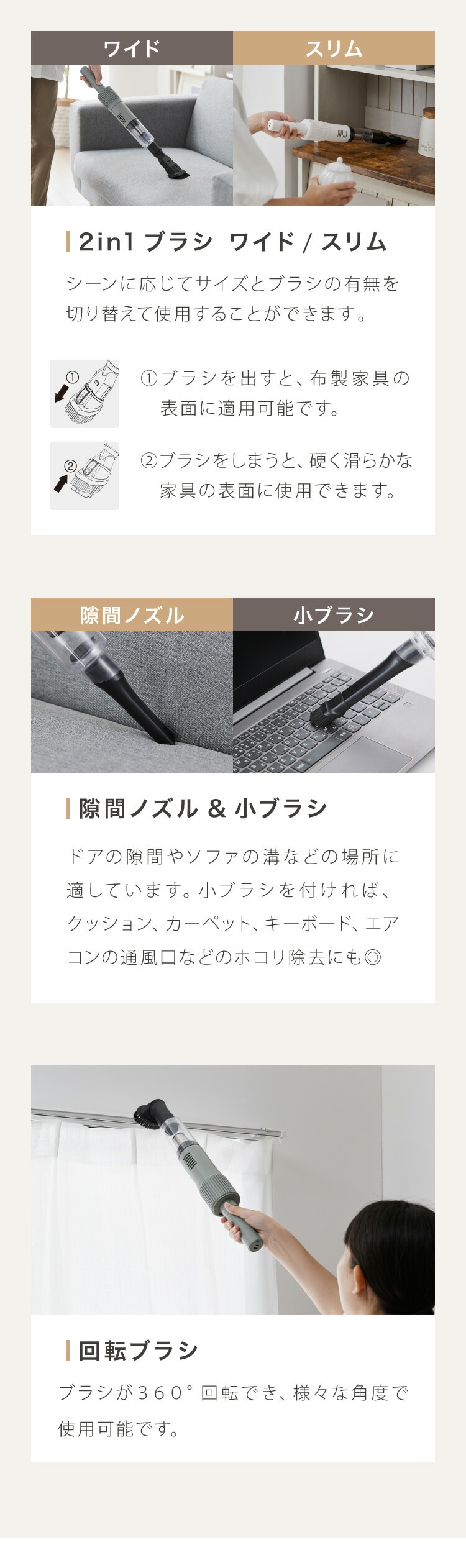 付属品:隙間ノズル&小ブラシ、ワイドブラシ、2in1ワイドブラシ、2in1スリムブラシ、回転ブラシ、USB充電ケーブル、取扱説明書