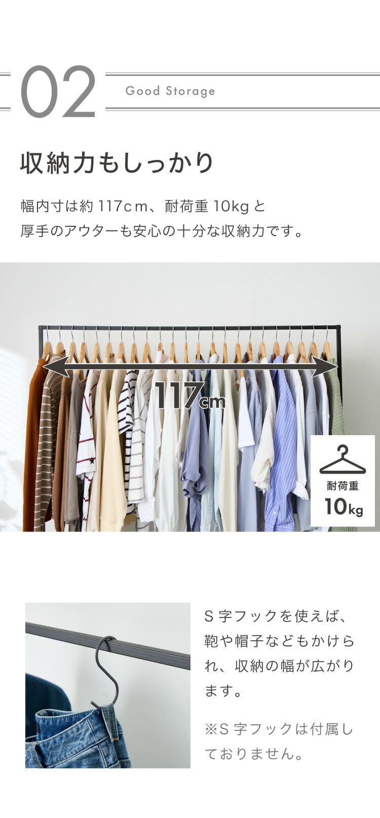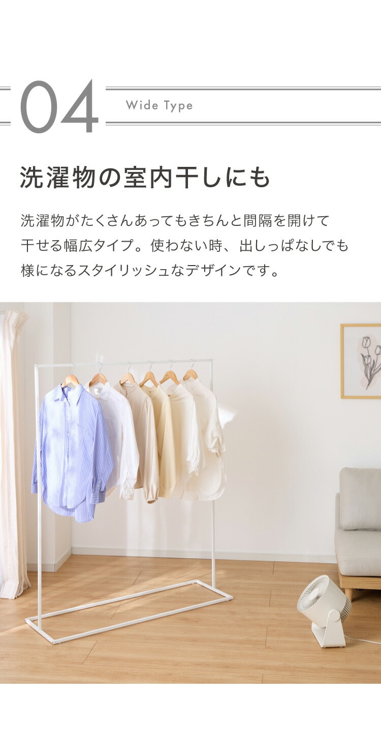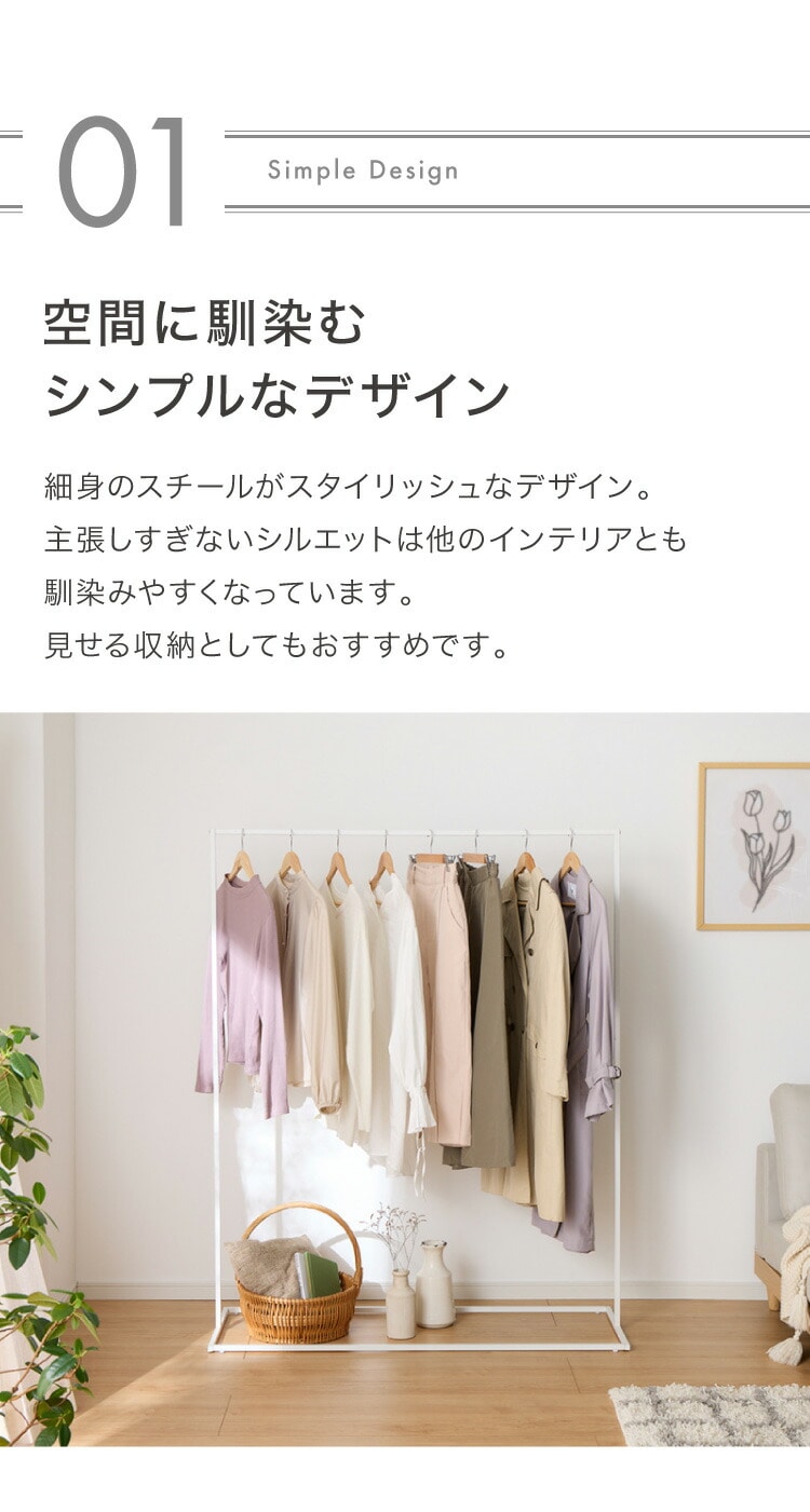 ・高さ150cmでロング丈のコートやワンピースもかけることができます。