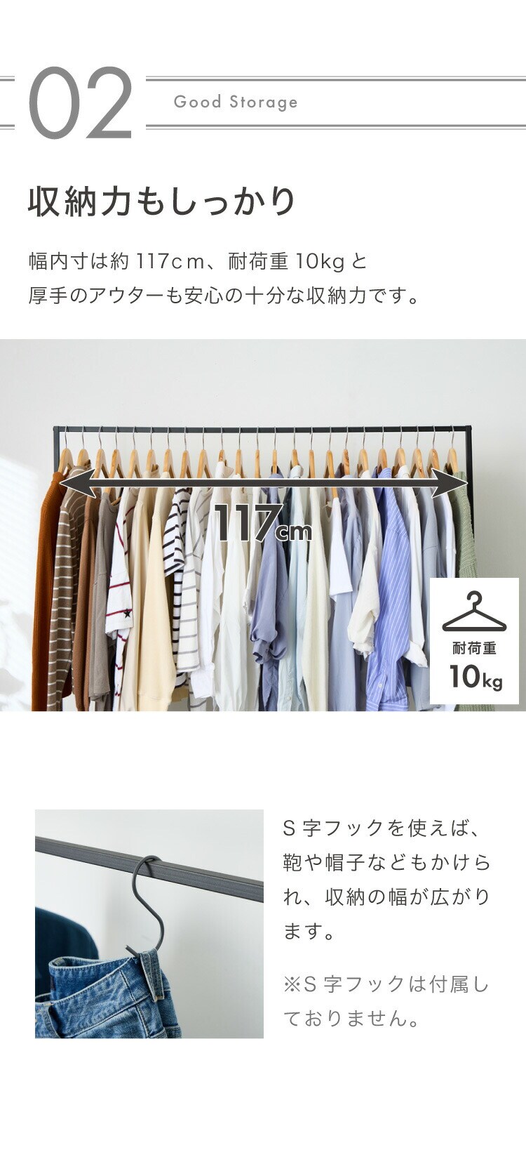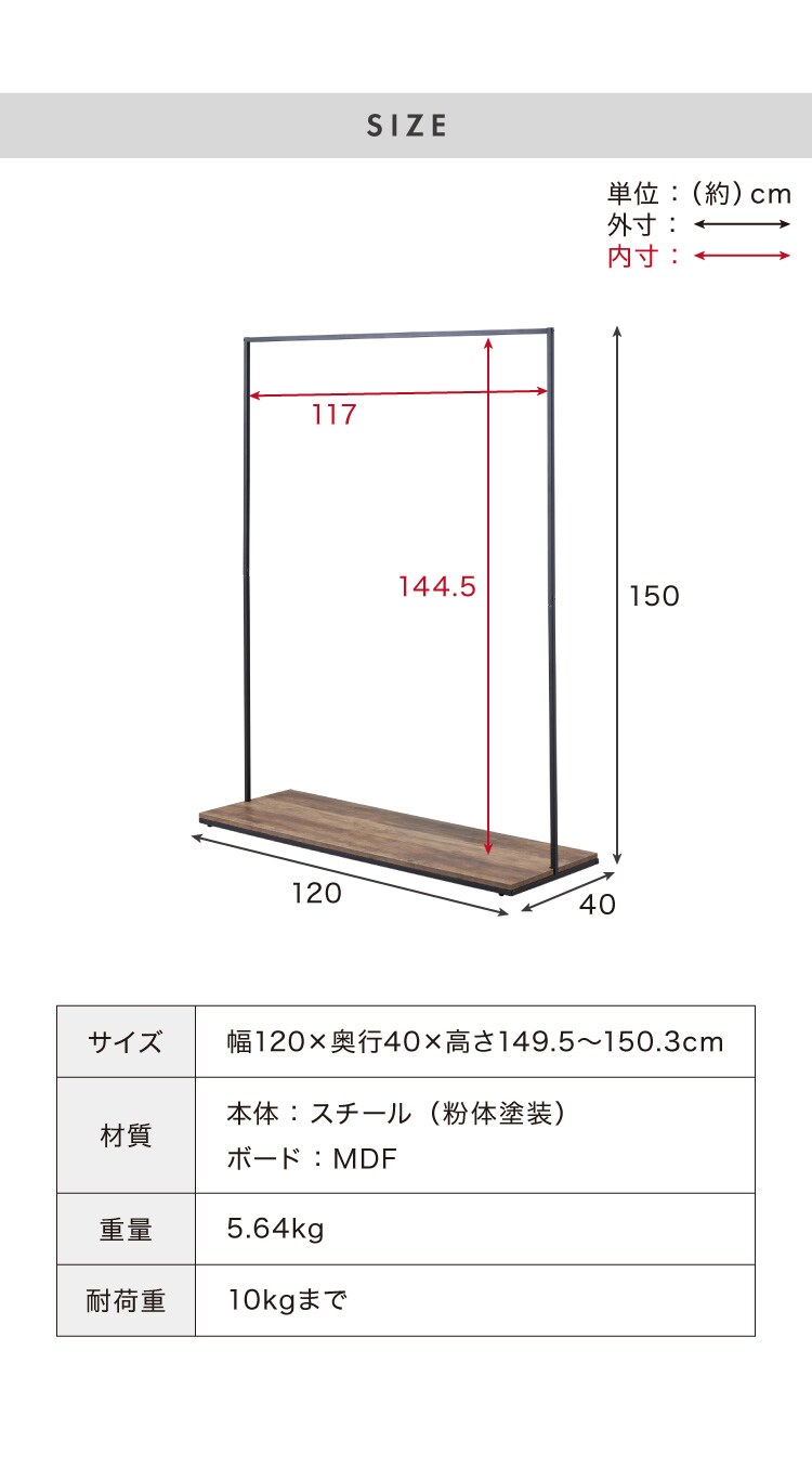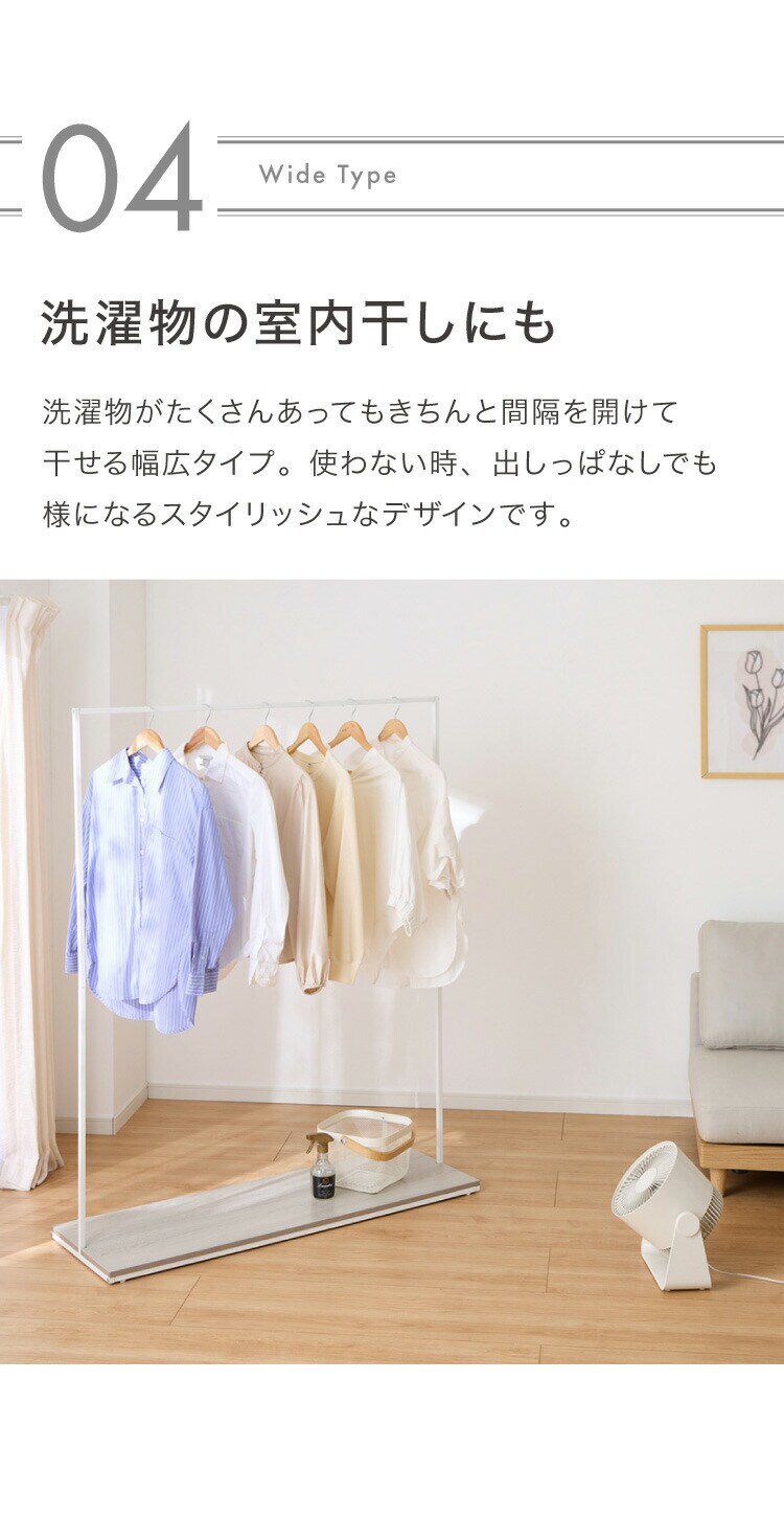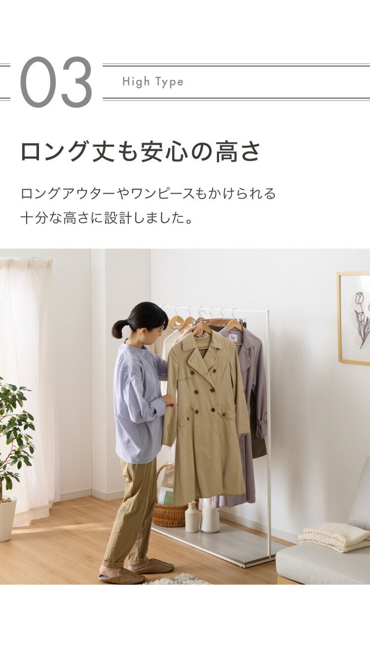 ・高さ150cmでロング丈のコートやワンピースもかけることができます。