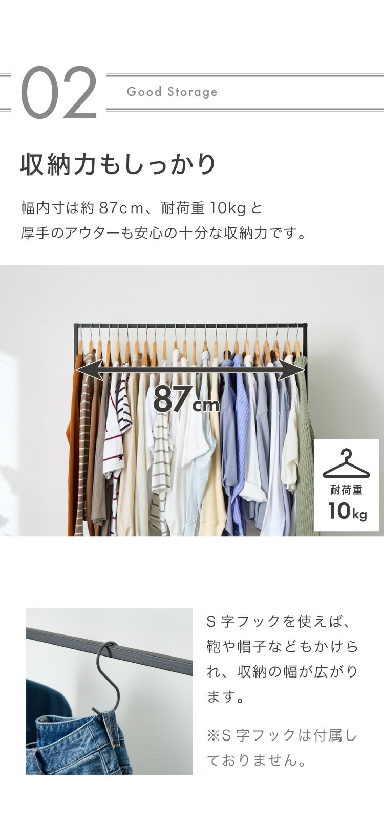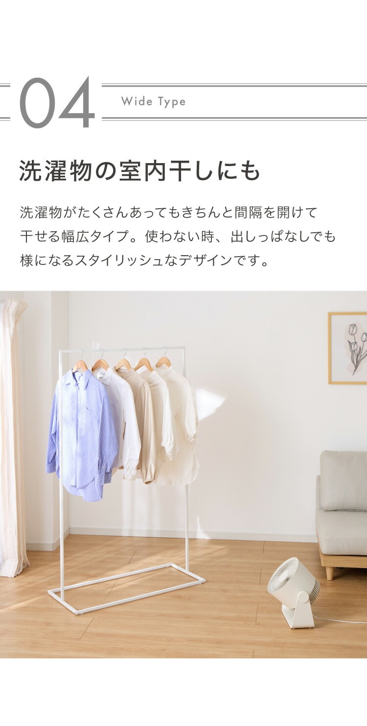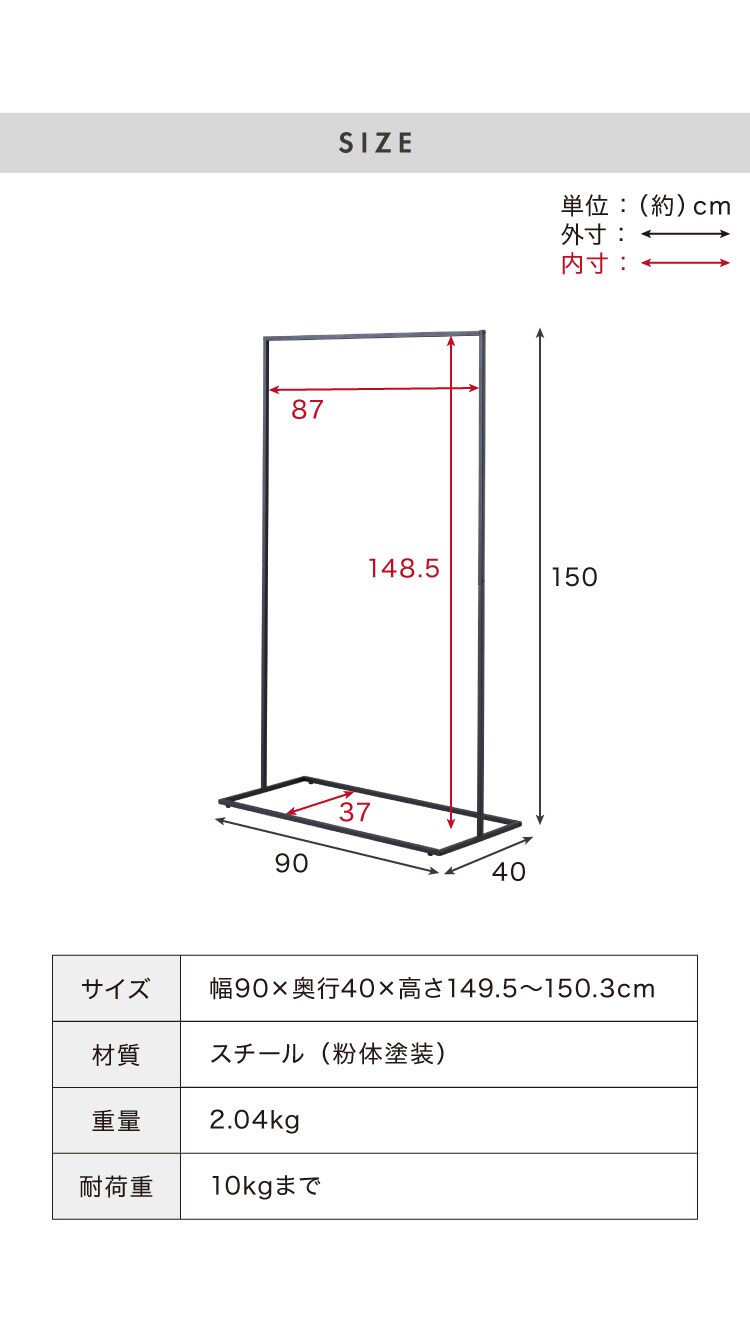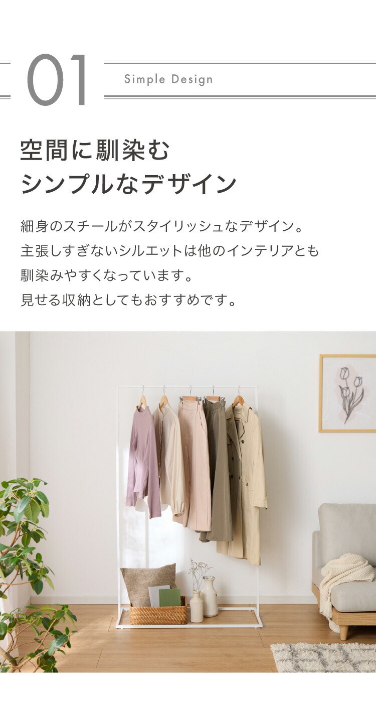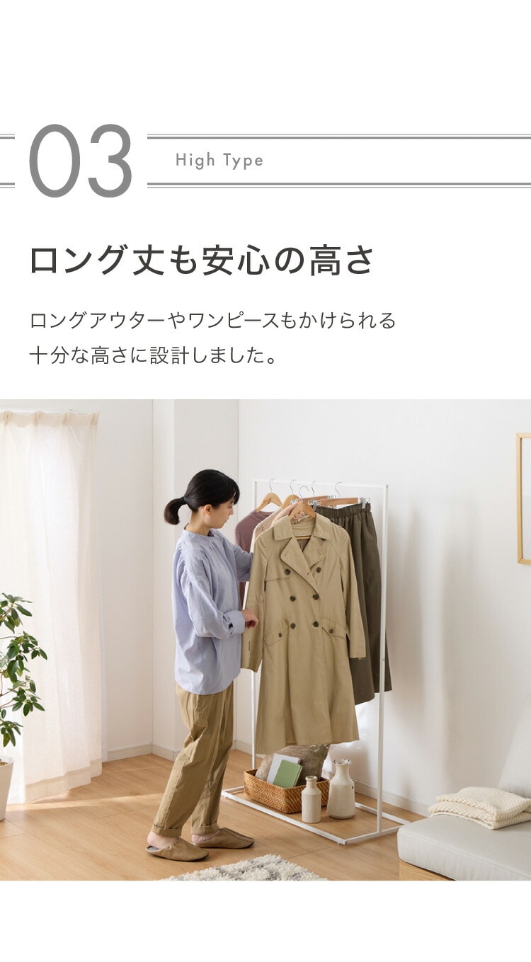 ・高さ150cmでロング丈のコートやワンピースもかけることができます。