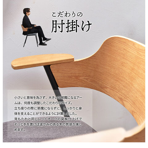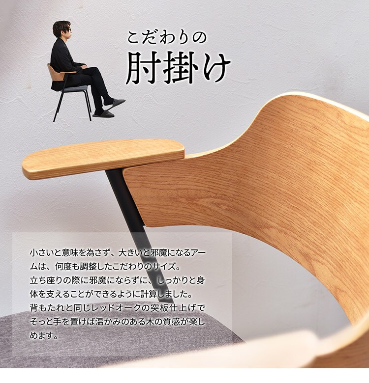 背もたれと同じレッドオークの突板仕上げでそっと手を置けば温かみのある木の質感が楽しめます。