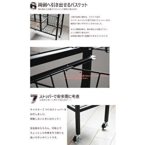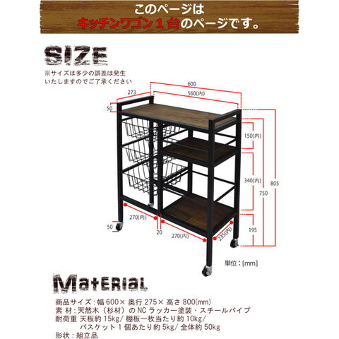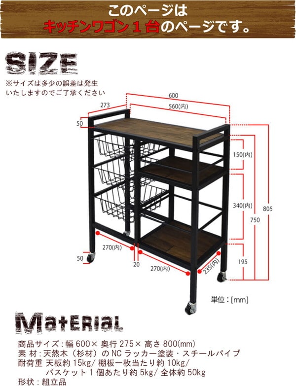 耐荷重:天板約15kg/棚板一枚当たり約10kg/バスケット1個あたり約5kg/全体約50kg