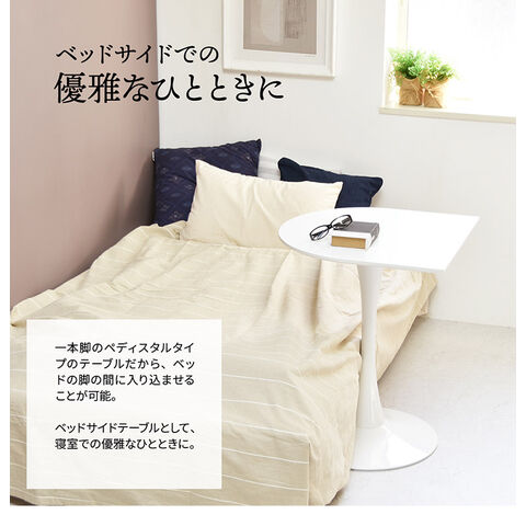 一本脚のペディスタルタイプのテーブルだから、ベッドの脚の間に入り込ませることが可能。