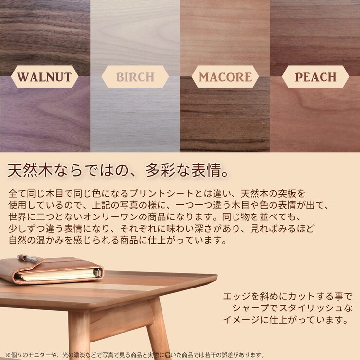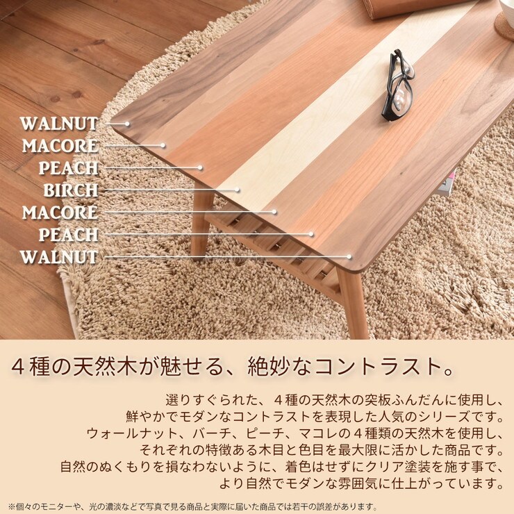 こちらの商品は、選りすぐられた4種類(ウォールナット、バーチ、ピーチ、マコレ)の天然木の突板を使用することで、個性的で温もりのある見事なコントラスを演出した商品です。また自然の温かみを失わぬように表面には着色せず、クリア塗装にする事で、木材本来の自然な色味が味わえ、より温もりのある逸品に仕上がっています。