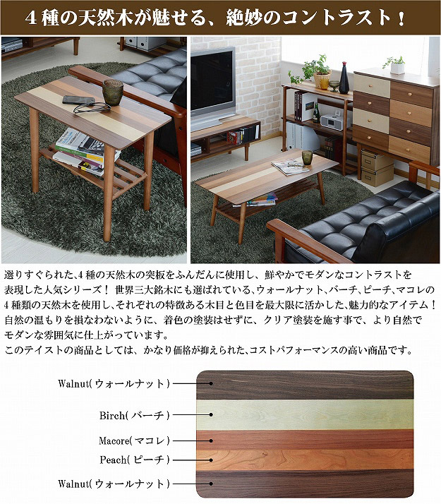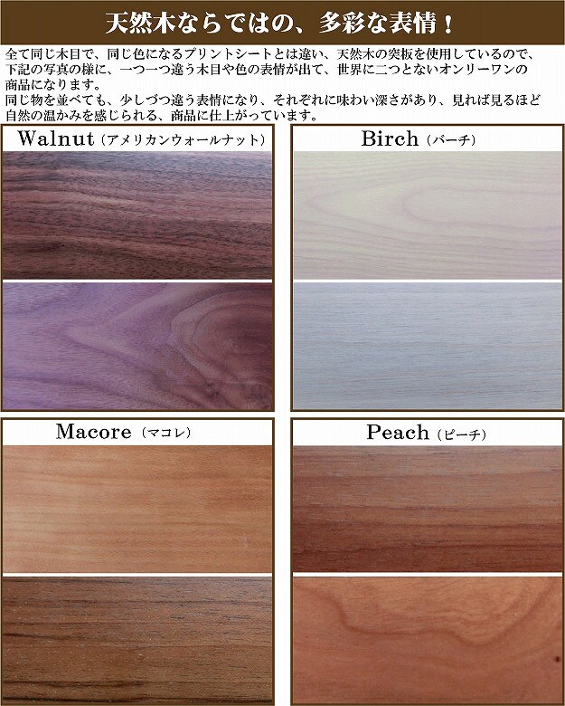 こちらの商品は、選りすぐられた4種類(ウォールナット、バーチ、ピーチ、マコレ)の天然木の突板を使用することで、個性的で温もりのある見事なコントラスを演出した商品です。