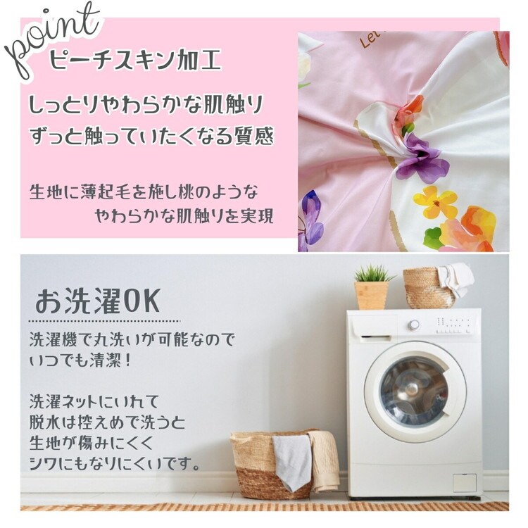 ピーチスキン加工で柔らかな肌触りの布団カバー。掛け布団カバー ボックスシーツ 枕カバーの3点セットでお部屋が一気に大変身! しわになりにくく、 乾きも早いのが特徴です。
