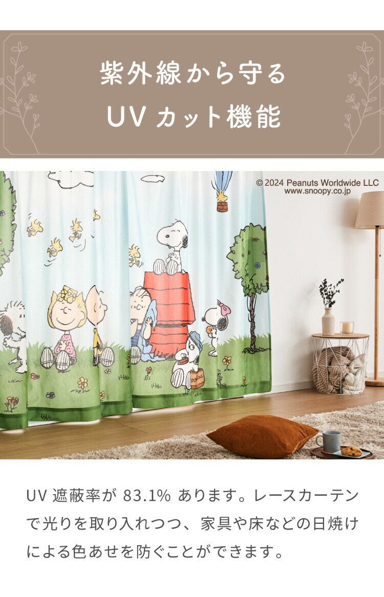 スヌーピー絵羽レースカーテン 2枚組 100×176cm UVカット 洗える 洗濯 プライバシー 目隠し カーテン 紫外線 おしゃれ かわいい PEANUTS スヌーピー チャーリーブラウン オラフ アンディ【送料無料】
