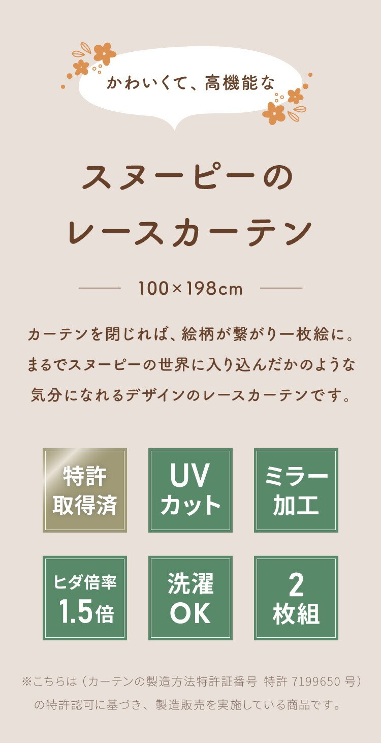スヌーピー絵羽レースカーテン 2枚組 100×198cm UVカット 洗える 洗濯 プライバシー 目隠し カーテン 紫外線 おしゃれ かわいい PEANUTS スヌーピー チャーリーブラウン オラフ アンディ【送料無料】