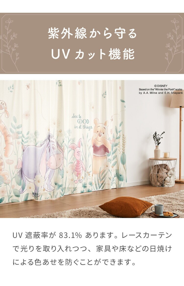 プーさん絵羽レースカーテン 2枚組 100×176cm UVカット 洗える 洗濯 プライバシー 目隠し フック付き カーテン 紫外線 おしゃれ かわいい ディズニー くまのプーさん ピグレット ティガー イーヨー【送料無料】