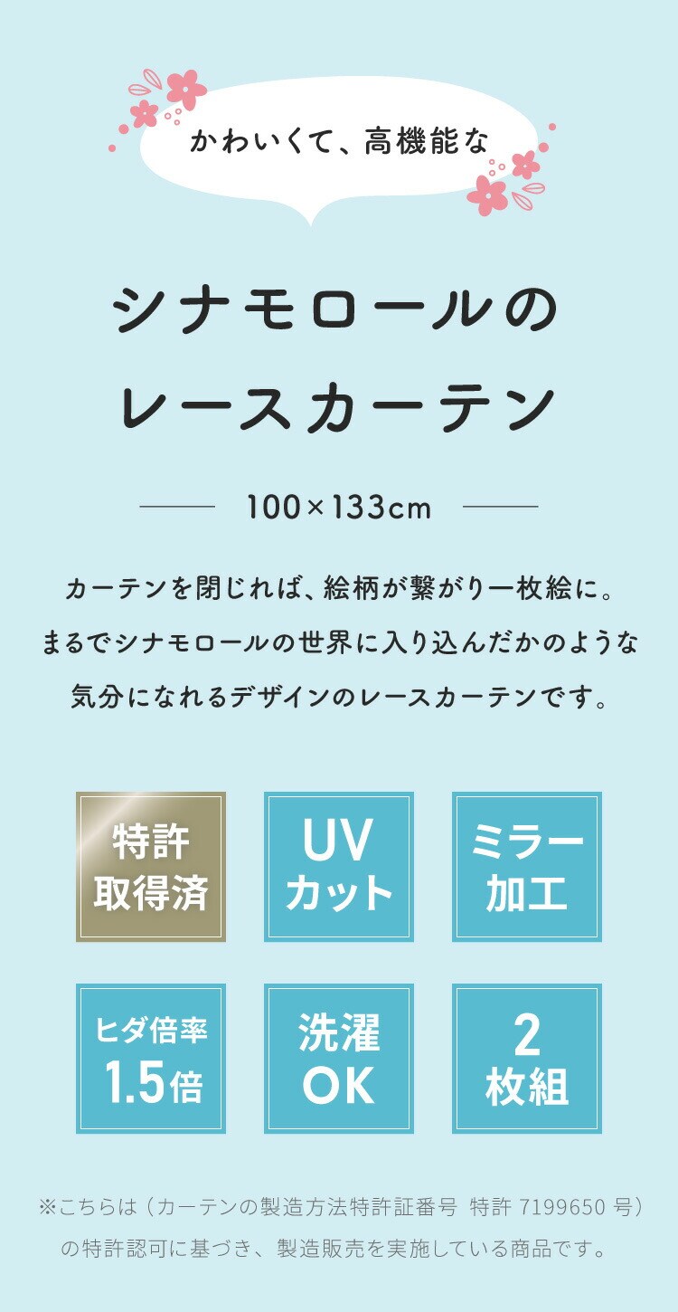 シナモン絵羽レースカーテン 2枚組 100×133cm UVカット 洗える 洗濯 プライバシー 目隠し フック付き カーテン 紫外線 おしゃれ かわいい サンリオ シナモロール ポロン コルネ【送料無料】