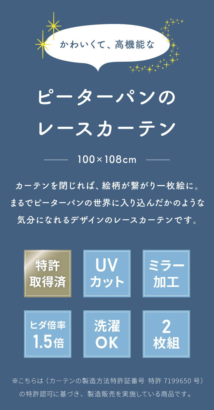 ピーターパン絵羽レースカーテン 2枚組 100×108cm UVカット 洗える 洗濯 プライバシー 目隠し フック付き カーテン 紫外線 おしゃれ かわいい ディズニー ピーターパン ティンカーベル ウェンディ【送料無料】