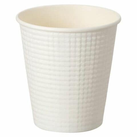 エンボス(凸凹)加工の紙を巻きつけて断熱性をもたせた紙コップです。
