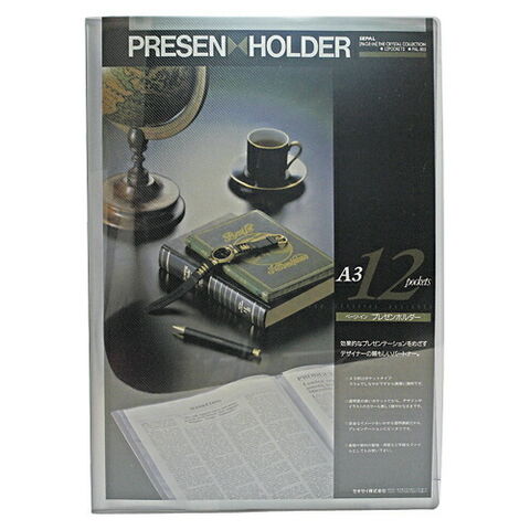 ポケット:12枚。規格:A3判タテ型。外寸:横318×縦432mm。背巾:8mm。中紙なし。ポケットシート厚:0.04mm。表紙/中袋:再生PP製。