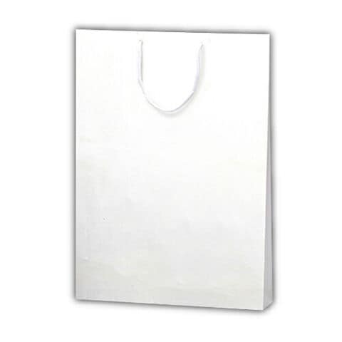 額縁がすっきり収まる手提げバッグです。あらゆるシーンに利用できる定番の白無地。表面に艶のある片艶晒クラフト素材です。持ち手はしっかりとしたPE製丸紐を使用。