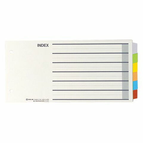 6色6山。7枚1組(扉紙、グレー、緑、黄、オレンジ、青、茶)。10組入。古紙使用。規格:5”×10”。ヨコ型(2穴)。横267×縦127mm。
