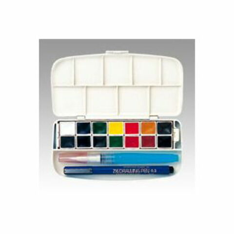 鮮やかな色合い透明水彩セット!携帯にも便利なコンパクトサイズ。【特長】・固形透明水彩14色、水筆ぺん、ペンをふたの内側がパレットに なっているコンパクトケースにセットしました。・透明感が魅力の「透明水彩」は色を混ぜても鮮やかさを失わないので、 重ね塗り、にじみ、ぼかし等の技法を使って美しい彩色が可能です。