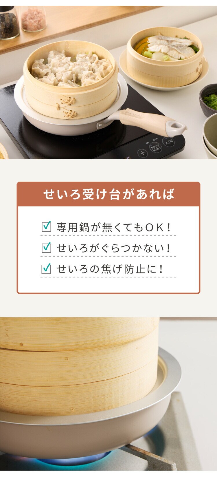 せいろ用の専用鍋が無くても、手持ちの鍋・フライパンでせいろを使った蒸し料理が可能になります。