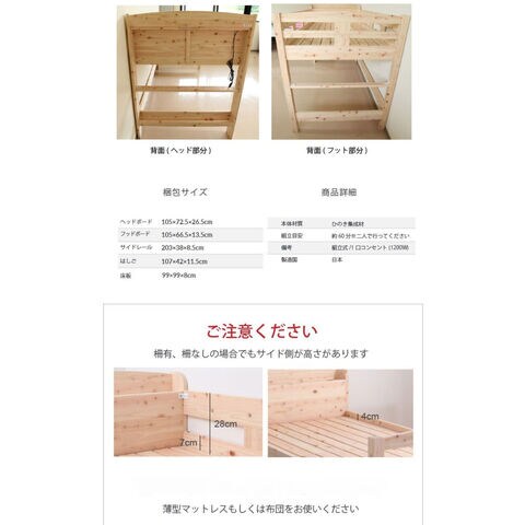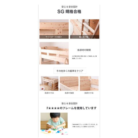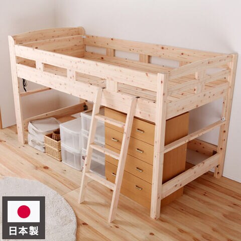 国産のヒノキ材を贅沢に使用したロフトベッド。床下を有効に活用できます。1口コンセント1200W