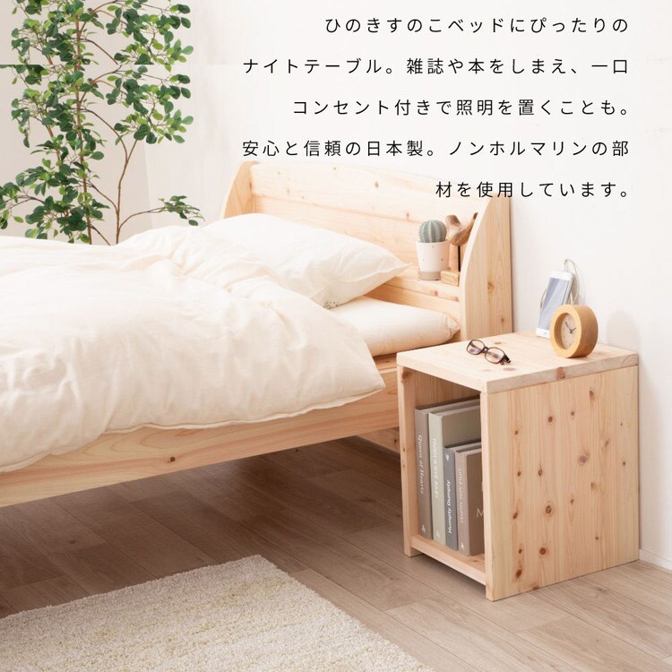 国産ヒノキを贅沢に使ったナイトテーブルです。1口コンセント 1200W付きです。