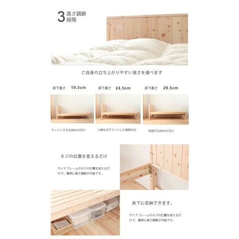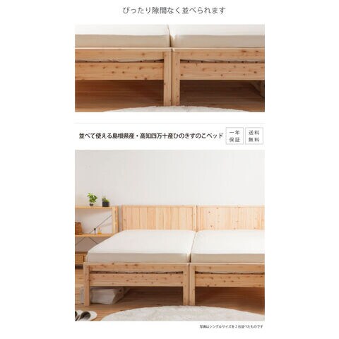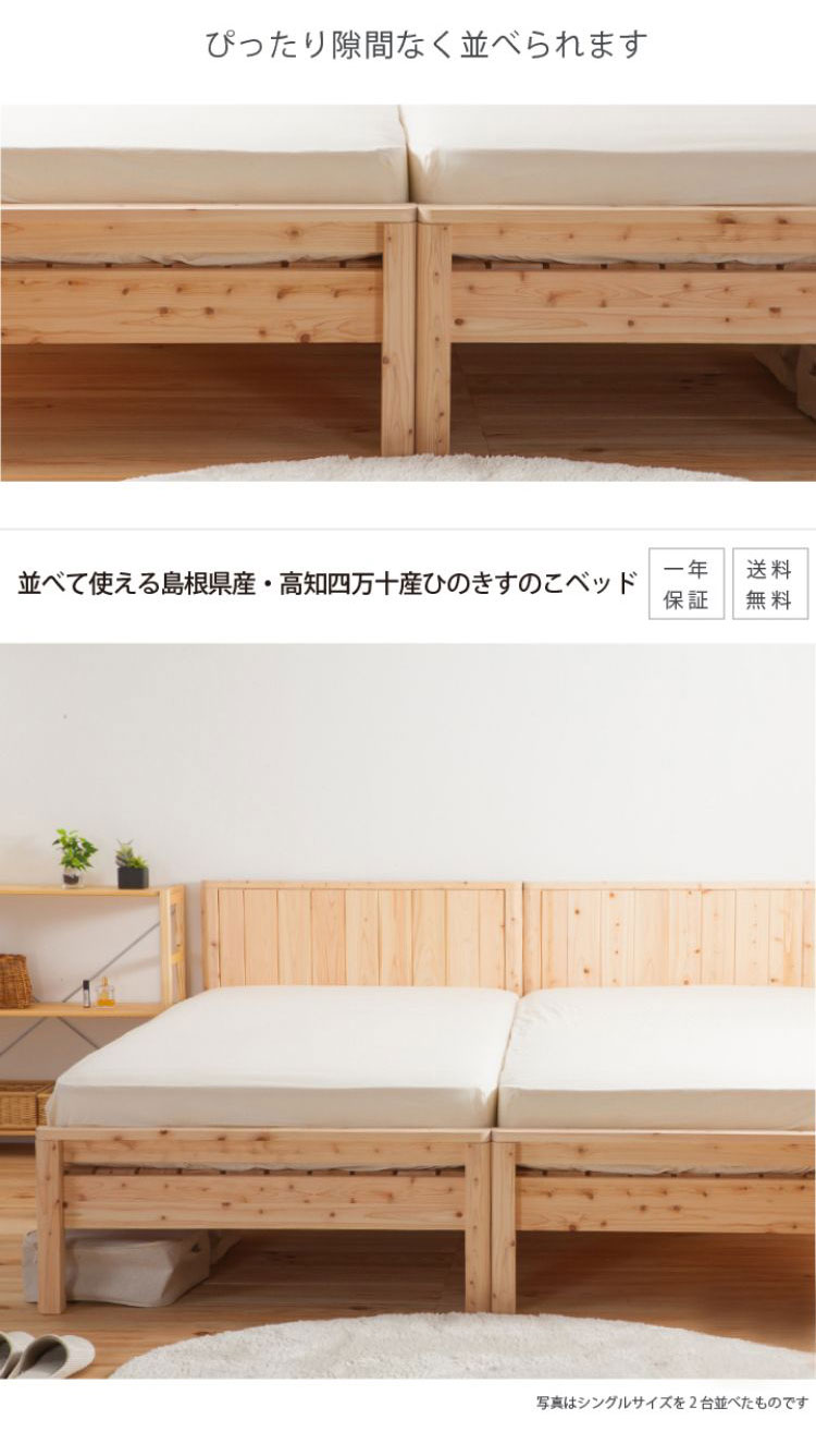 国産ヒノキを贅沢に使ったベッド。高さ3段階調整可能。ピッタリ並べて使用可能です。