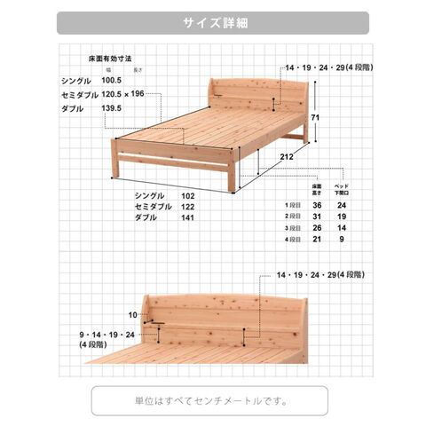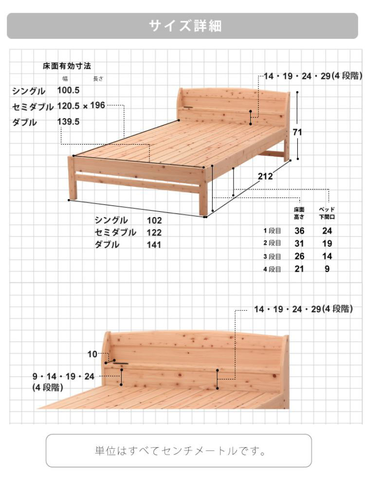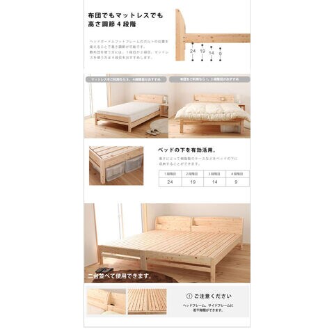 国産ヒノキを贅沢に使ったベッド。高さ4段階調整可能。便利な棚コンセント付き。2口コンセント1500W