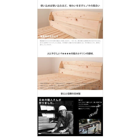 国産ヒノキを贅沢に使ったベッド。高さ4段階調整可能。便利な棚コンセント付き。2口コンセント1500W