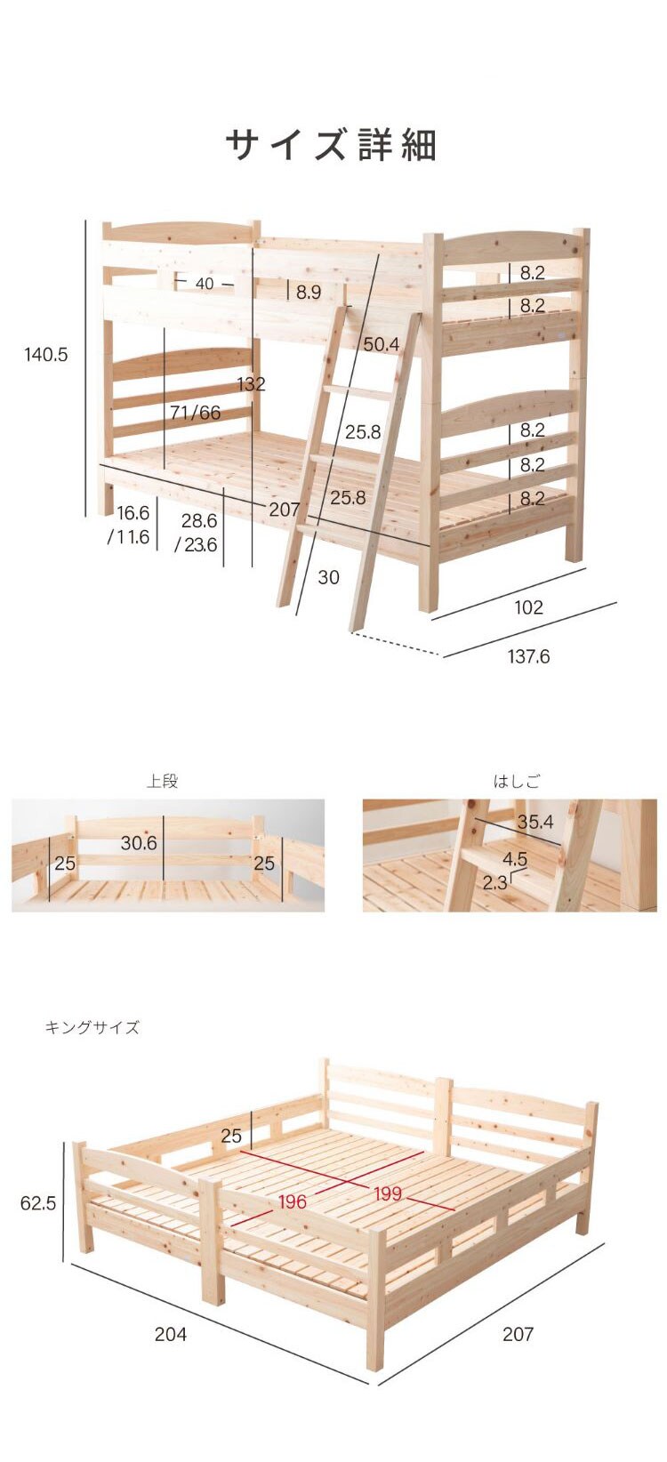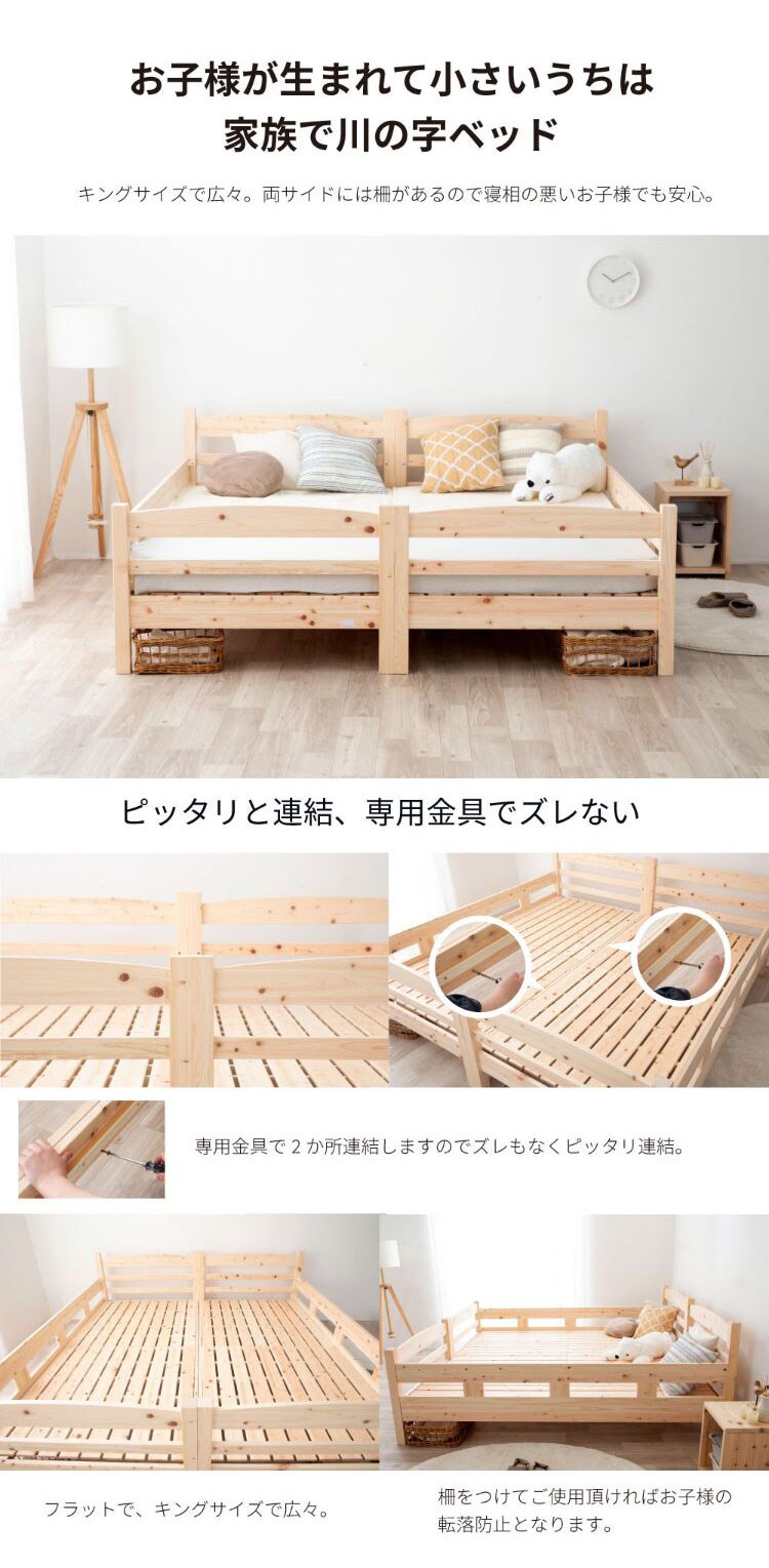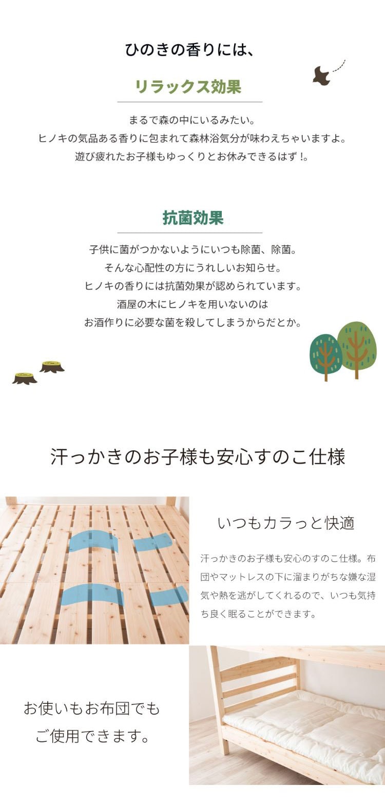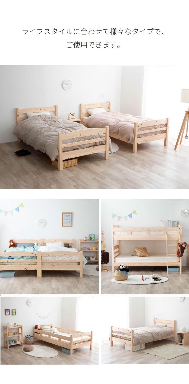 国産のヒノキ材を贅沢に使用した2段ベッド。並べて連結する事もできます。